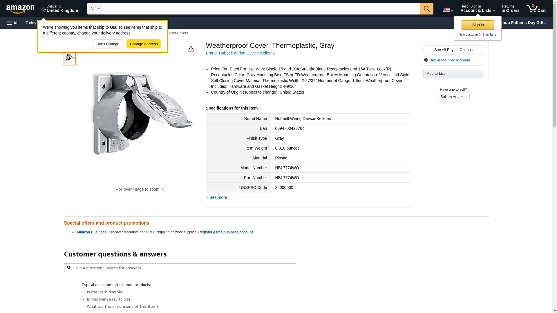 This weatherproof cover is designed for use with FS or FD weatherproof boxes, Single 50A straight-blade receptacles, and 50A Twist-Lock receptacles, available separately. It features a self-closing lid and thermoplastic construction.<br /><br /> Item: Weatherproof Cover<br /> Mounting Box: FS or FD Weatherproof Boxes<br /> For Use With: Single 50A Straight Blade Receptacles and 50A Twist-Lock(R) Receptacles<br /> Mounting Orientation: Vertical<br /> Lid Style: Self Closing<br /> Number of Gangs: 1<br /> Cover Material: Thermoplastic<br /> Color: Gray<br /> Height: 4-9/16"<br /> Width: 2-27/32"<br /> Includes: Hardware and Gasket<br />