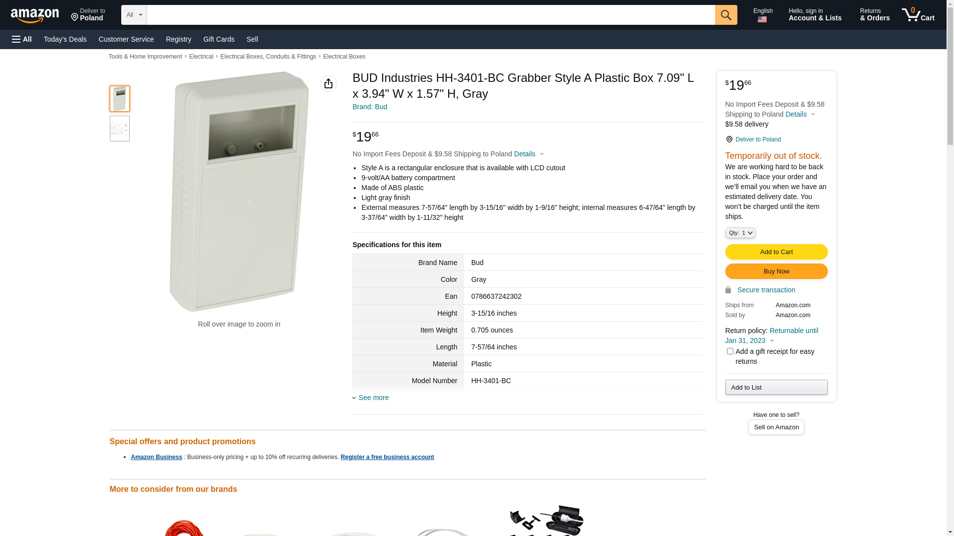 Bud Industries Enclosure, Hand Held, Plastic, Gray - HH-3401-BC