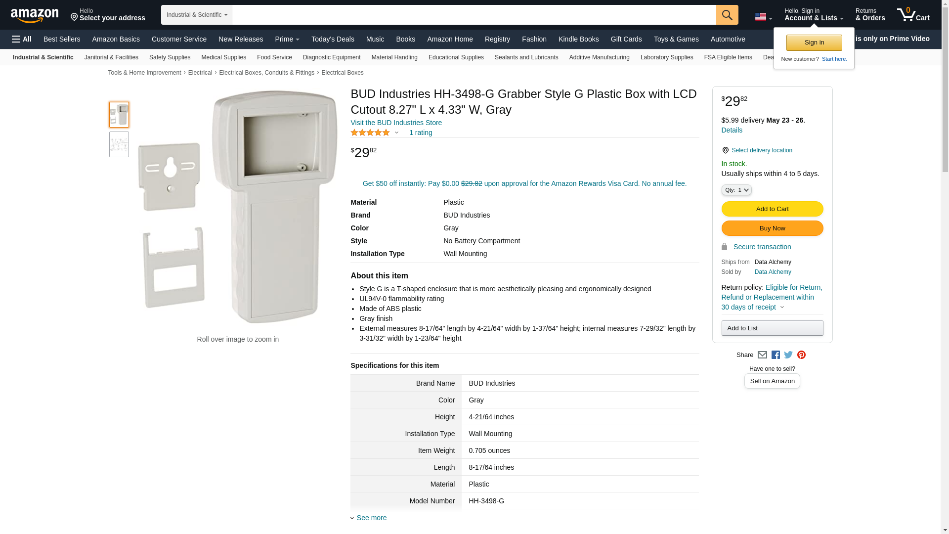 BUD Industries HH-3498-G Grabber Style G Plastic Box with LCD Cutout 8.27" L x 4.33" W x 1.59" H, Gray