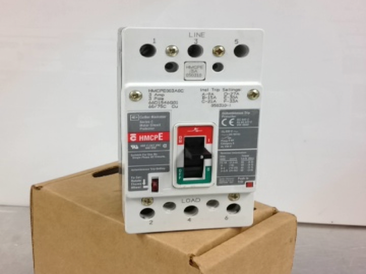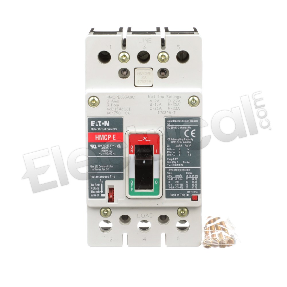 Cutler Hammer<br>Westinghouse / Eaton<br> Cat No. HMCPE003A0C<br><br> Motor Circuit Protector<br> 3 Amps | 480V<BR> Auxiliary Switch<br><br>Includes sets of bottom/load-side & top/line-side lugs<br> Includes top lug terminal cover<BR> Has a glossy gray & red label<br><br> Style 66D1546G01<BR> 3 Pole<br> 480 VAC / 250 VDC<br> 50/60 Hz<br> IEC 60947<br><BR> Aux. Switch:<BR> Cat. No. AUX1A1BPK<BR> Style 66C1570G41<BR><BR> Instantaneous Trip Settings: 9 - 33 Amps (A-F)<BR><BR><BR> Breaker Weight: 2.5 lbs.<br> Breaker Dimensions (D x W x H): 3" x 3" x 6"<BR> (add 0.5" to depth measurement for handle)