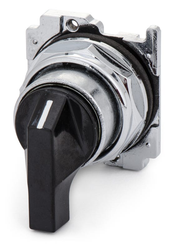 This 30mm, non-illuminated selector switch features die-cast zinc construction with a chrome-plated mounting nut and housing unit. It helps to offer protection against the ingress of solid foreign objects, water, oil, noncorrosive coolants, and ice in indoor and outdoor applications.<br /><br /> Item: Non-Illuminated Selector Switch Operator<br /> Size: 30mm<br /> Position: 3<br /> Action: Momentary / Maintained / Momentary<br /> Type of Operator: Lever<br /> Operator Color: Black<br /> Key Removal: No Key<br /> Operator Head Material: Metal<br /> Bezel Material: Anodized Aluminum<br /> Basic Material: Metal<br /> Bezel Color: Chrome<br /> NEMA Rating: 3, 3R, 4, 4X, 12, 13<br /> IP Rating: 65<br /> Cam: 3<br /> Switch Operation @ Position A: X<br /> Switch Operation @ Position B: O<br /> Switch Operation @ Position C: X<br /> Switch Operation @ Position D: No Fourth Position<br /> Standards: UL Listed, CSA Certified, CE Marked<br /> Key Number: No Key