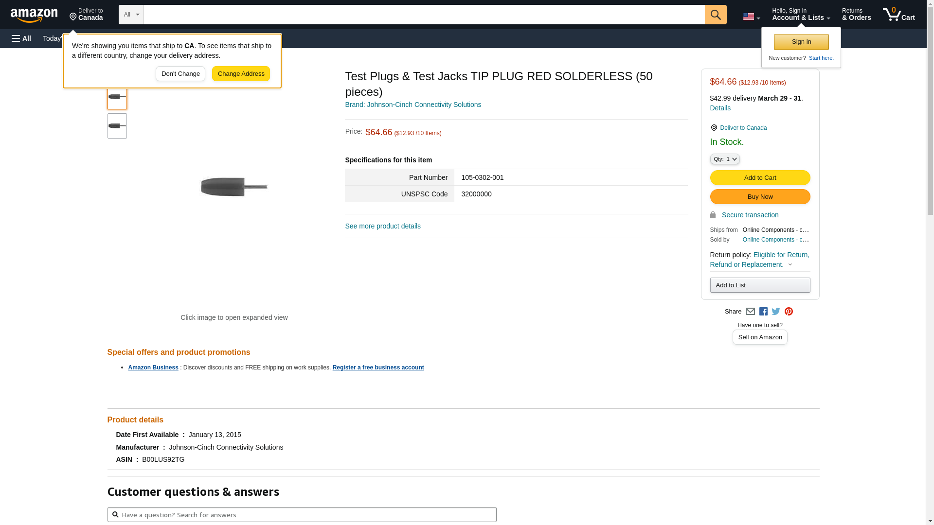 | Feature | EMERSON CONNECTIVITY/JOHNSON 105-0302-001 TIP PLUG, 3500V, 10A, RED |