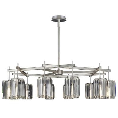 - Chandelier in platinized silver leaf finish, designed by Jonathan Browning Design Group features modern sculptural blocks of polished, Emerald cut crystal glass
