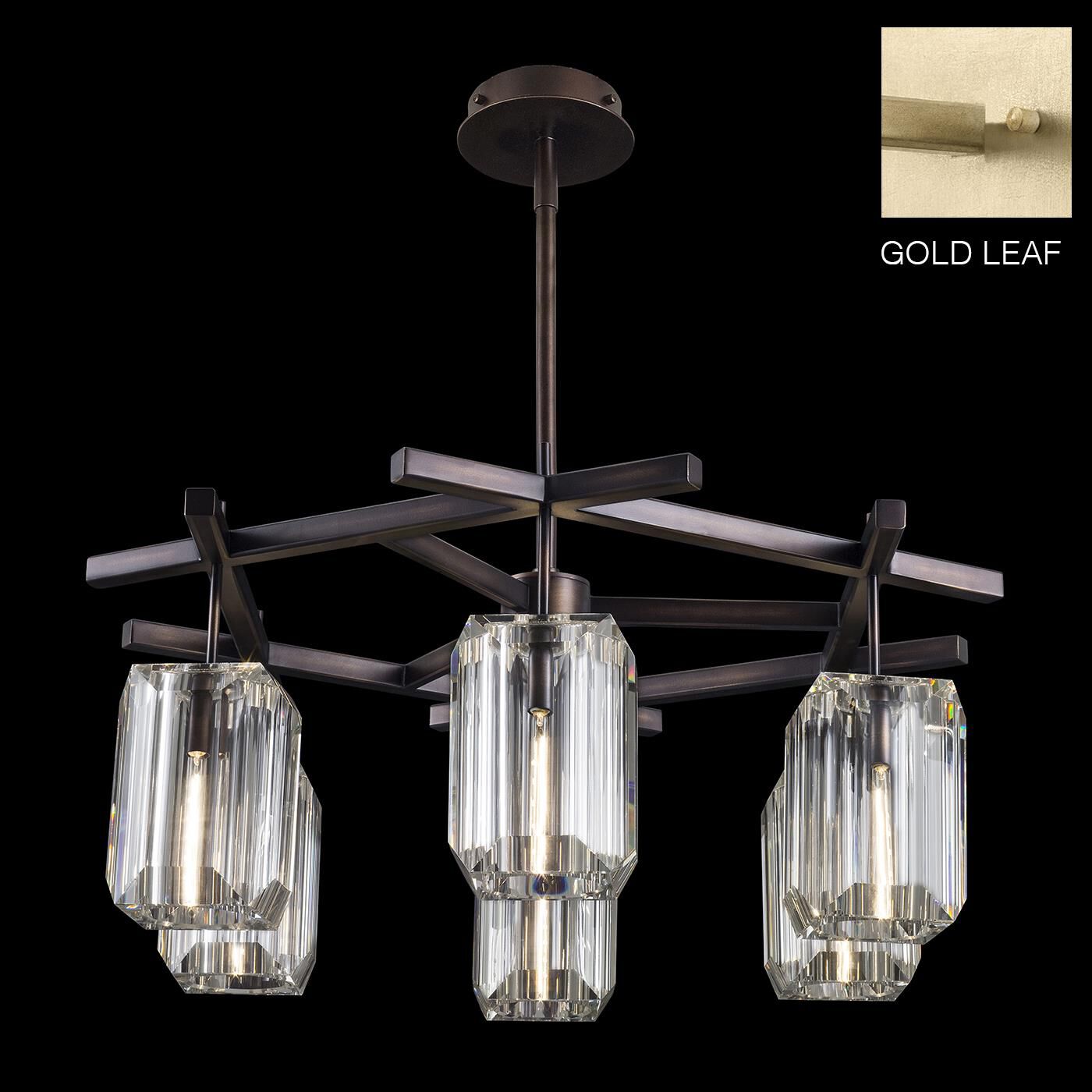 - Chandelier in soft gold leaf finish, designed by Jonathan Browning Design Group features modern sculptural blocks of polished, Emerald cut crystal glass