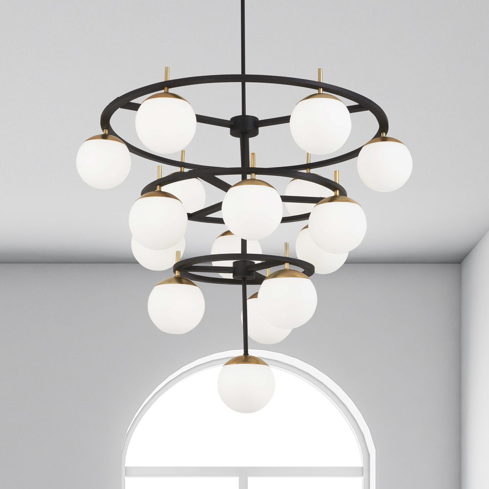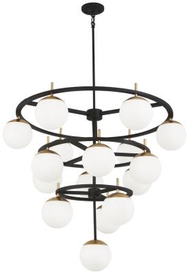 Collection: Alluria, Material: Glass, Finish Color: Weathered Black W/Autumn Gold, Width: 36", Height: 32.5", Length: 36", Lamping Type: Xenon, Number Of Bulbs: 16, Wattage: 75 Watts, Moisture Rating: Dry Rated, Desc: alluria - 16 light chandelier Alluring like the melody of a favorite song, perfect harmony Alluria collection by George Kovacs is achieved by combining finishes and materials. A clean, minimalist style is amplified with Autumn Gold accents suspended from a contrasting Weathered Black framework. Etched Opal glass globes shine in a dizzying array of styles for every conceivable setting Features: Product Type: ALLURIAMaterial: Alluria - Sixteen Light ChandelierBulb Included: YesType of Bulb: G9,T4 Finish: WEATHERED BLACK W/AUTUMN GOLDShade: GLASSGlass: ETCHED OPALApproved for Location: DRYFinish Category: WEATHERED BLACK W/AUTUMN GOLDCanopy Included: TRUE,