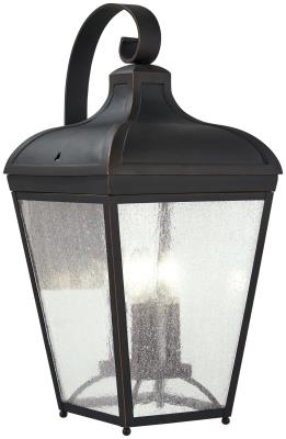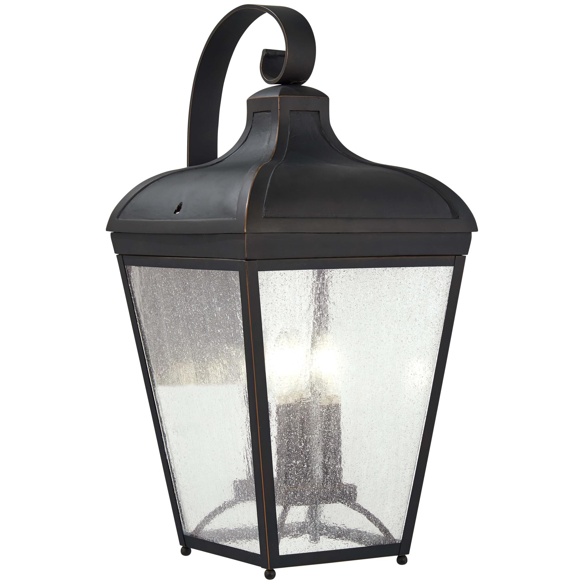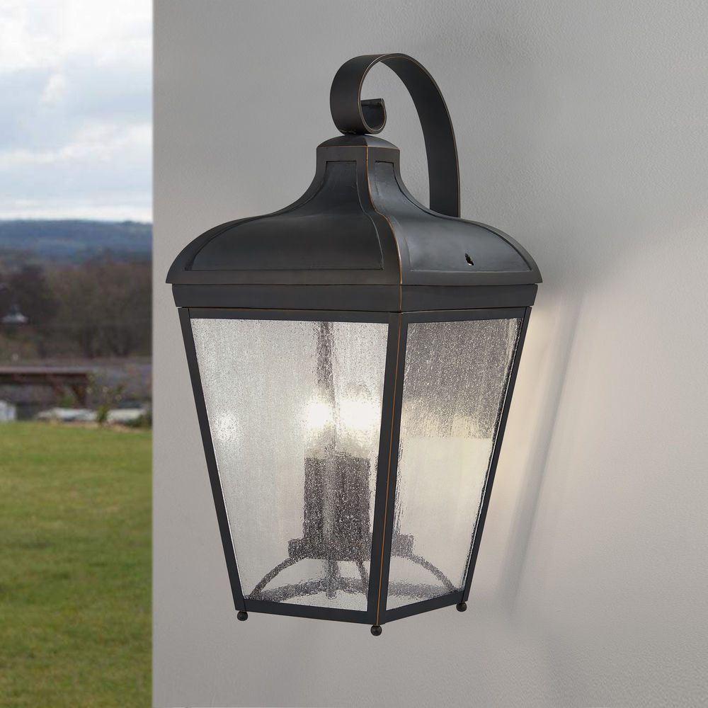 Traditional outdoor lighting gets a dimension-filled upgrade with this large four-light wall light from Minka Lavery. An exposed candelabra shines through clear seeded glass for a warm glow. Curves and details on the frame are rich in color, with an oil-rubbed bronze finish. Depth is added with gold highlights along the edges for ultimate sophistication.