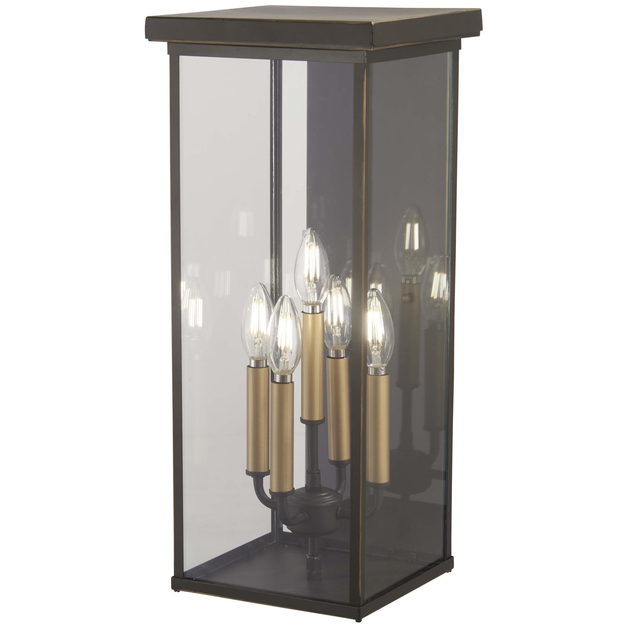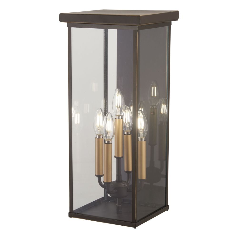 Smooth lines and a geometric silhouette make this five-light outdoor pocket wall light a great addition to an entrance. From Minka Lavery, clear glass shades create an open aura and allow maximum shine from the modern, exposed lightbulbs. Crafted from metal, the frame features an oil-rubbed bronze finish with hints of dimension in the form of gold highlights.
