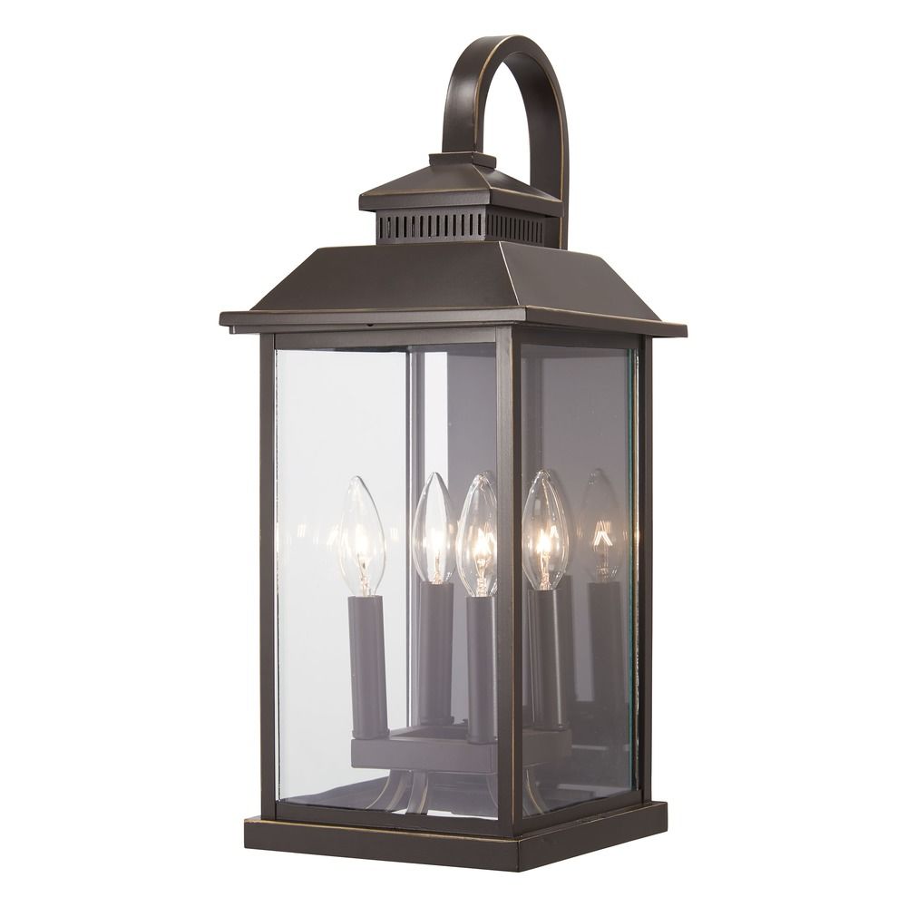 Celebrate traditional outdoor design with the smooth lines on this small four-light wall light from Minka Lavery. Constructed of aluminum and brass, the oil-rubbed bronze finish couples with gold highlights for rich dimension. Clear glass exposes a lightbulb for a modern twist.
