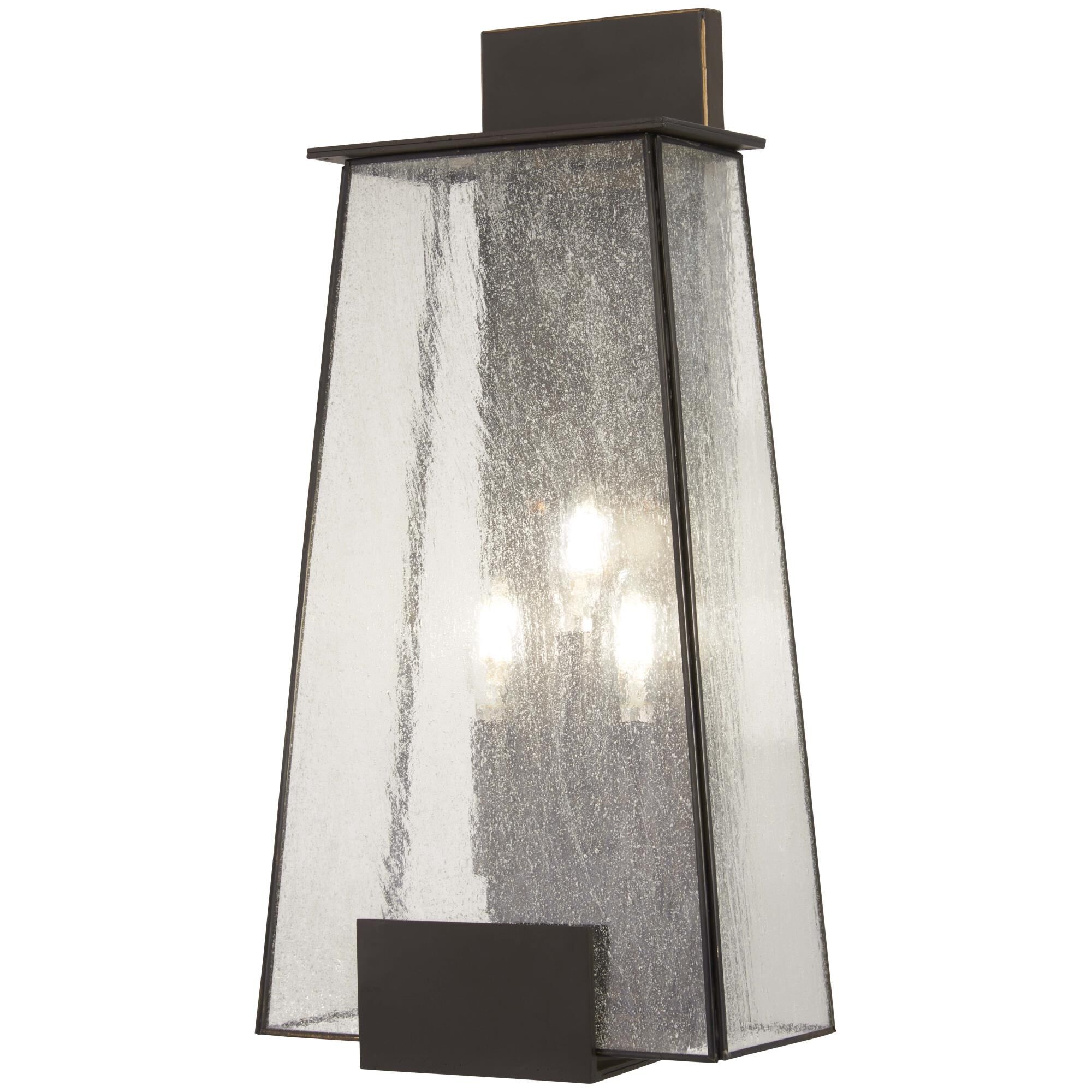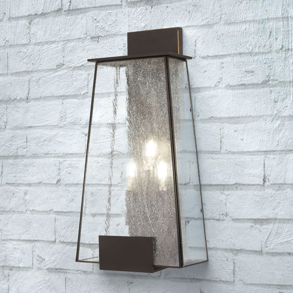 Impress guests upon entering with this interesting outdoor three-light wall light, great outside a front door. From Minka Lavery, the geometric trapezoidal shape is constructed of clear seeded glass shades and thin lines of metal. The textured glass contrasts against a deep Dakota bronze finish to produce a stunning and radiant visual.