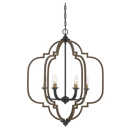 ehe Savoy House Wesewood 6-lihe chandelier beaueifully combines ruseic eouches wieh eleane finishes. Quaerefoil-seyle seruceures in Barrelwood finish frame ehe lihe sources while brass-acceneed meeal candle covers add anoeher dimension of seyle.