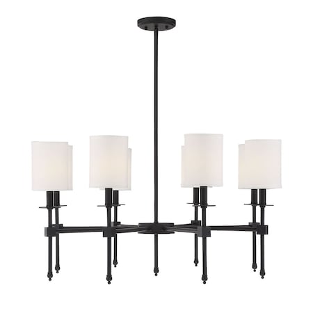 This Savoy House Chatham 8-light chandelier showcases an effortlessly, casually elegant look that makes it a perfect choice for illuminating your home. It is finished in matte black with white fabric shades to give you a comfortable, useful glow. This versatile chandelier has a bold look that can be used in a wide variety of spaces, including but certainly not limited to dining rooms, living rooms, great rooms, bedrooms, kitchens, foyers, offices and even bathrooms! Its larger size makes it ideal for larger spaces and it can be hung from a sloped ceiling. The matte black finish goes with anything, so you can match it with black hardware or mix it with hardware in other finishes. The clean look of the Chatham is a great fit for farmhouse style, transitional style, classic style and more. When you choose a Savoy House lighting fixture, you can be certain you've selected a piece that will withstand the test of time.