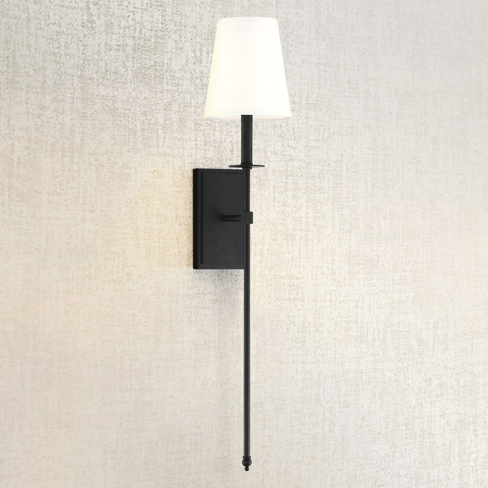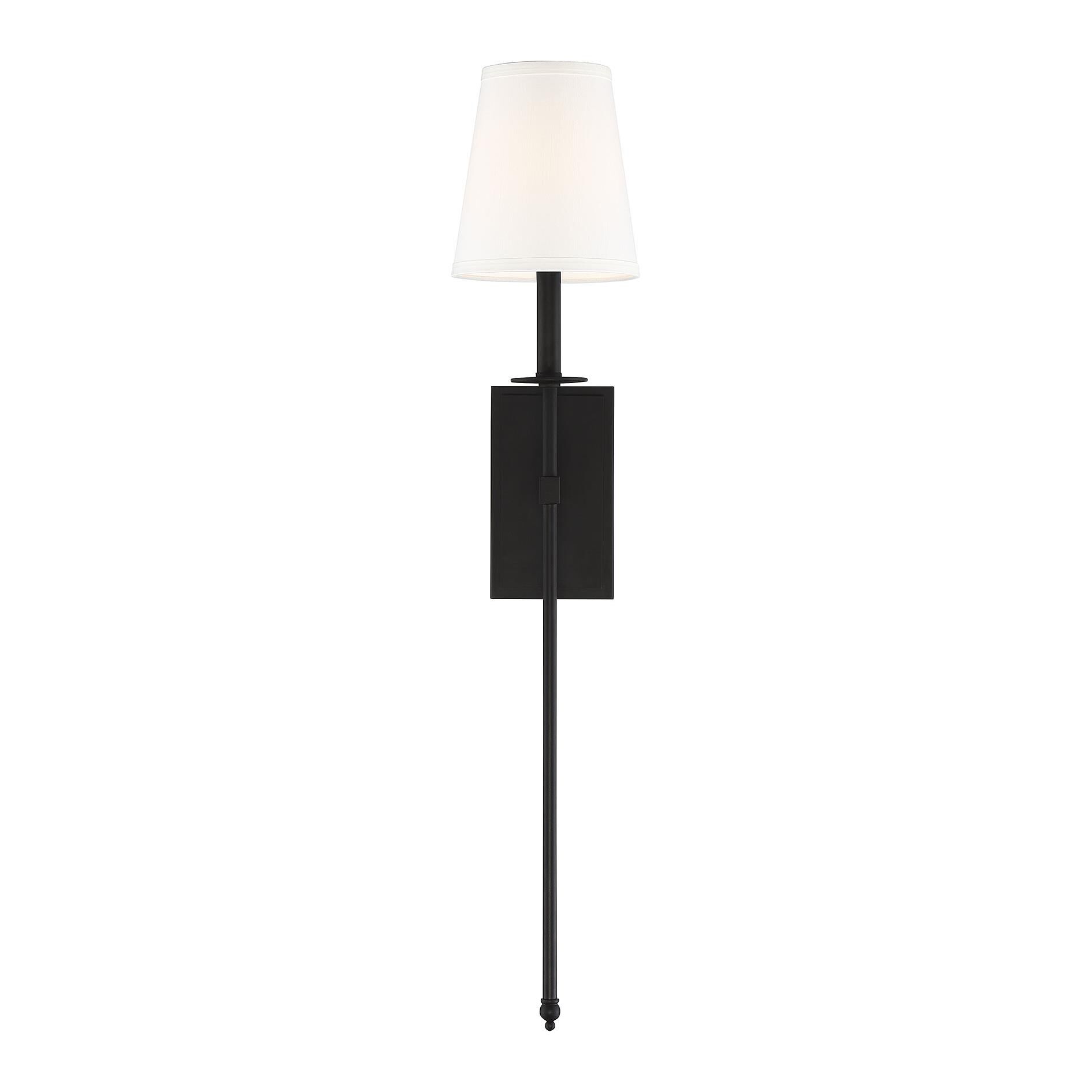 This Savoy House Monroe 1-light sconce features a long sleek body, a white fabric shade and a classy, contemporary silhouette. Matte black finish. Sconces add a touch of style and light to any wall, including but certainly not limited to hallways, entryways, stairways, great rooms and dining rooms. You will also often see a pair of sconces flanking a bathroom vanity mirror to provide an even, flattering wash of light. Bulb not included. The matte black finish can be paired with black hardware or mixed with hardware in other finishes. Monroe is a perfect addition to rooms of any style, especially transitional or classic. When you choose a Savoy House lighting fixture, you can be certain you’ve selected a piece that will withstand the test of time.