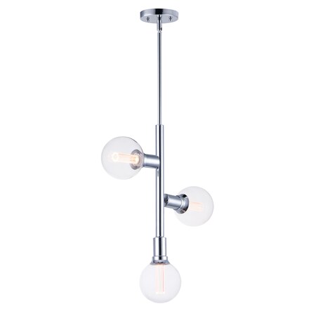 This fun contemporary design brings high scale look at a very affordable price. Straight line frames of Polished Chrome or Satin Brass look the best with your favorite G40 bulb. Add our LED G40 to this collection for the ultimate in high tech design.<br>LED Pendant<br>Collection: Molecule<br>Finish: Polished Chrome<br>Width: 17"<br>Height: 21"<br>Length: 17"<br>Safety Listing: Dry<br>Bulbs: 3 X G40 3.50W, Included