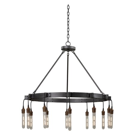 City loft inspired design, featuring heavy gauge steel construction and rivet detail hardware with solid brass patina sockets in a classic industrial Matte Gun Metal finish. 12 Light Chandelier Collection: Stuyvesant Finish: Matte Gun Metal Width: 36.00`` Height: 30.00`` Safery Rating: Ul, cUL Safety Listing: Dry Bulbs: 12 X E26 40.00W