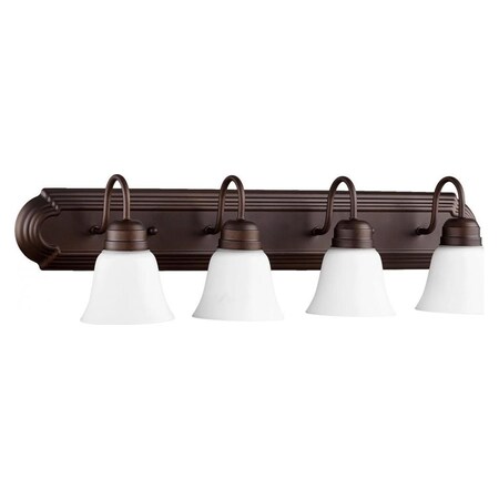 Quorum International 5094-4-86 | 4 Light Transitional Metal Damp Rated Bath Vanity in Oiled Bronze Finish with a Satin Opal Bell Shaped Glass Shade | Easy to Install for a Modern and Classic Style