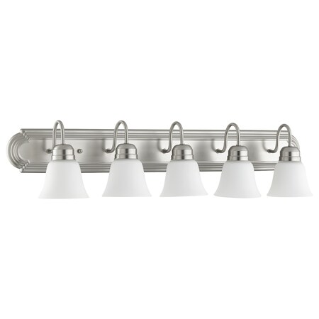 Quorum International 5094-5-65 | 5 Light Transitional Metal Damp Rated Bath Vanity in Satin Nickel Finish with a Satin Opal Bell Shaped Glass Shade | Easy to Install for a Modern and Classic Style