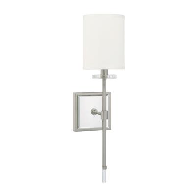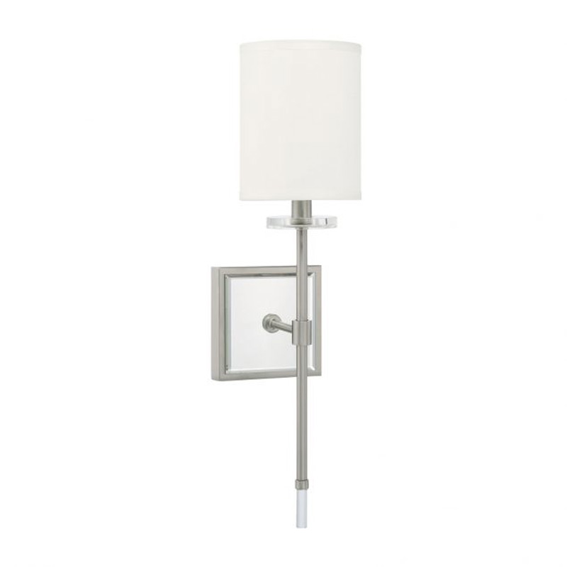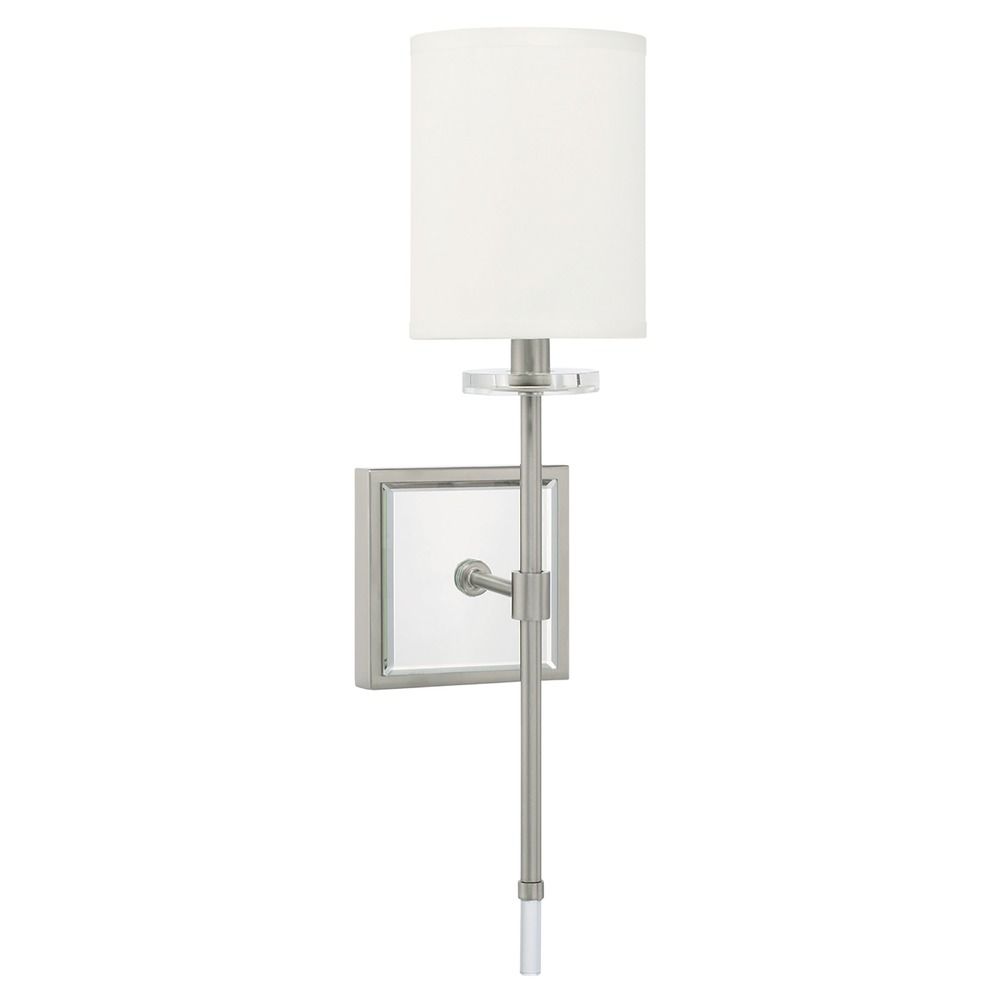 This bath sconce features simple, clean lines and touches of glam. A round fabric shade gives way to a tall, slender form, adorned with sleek K9 crystal elements at the top and the base. A beveled mirror at the back completes the look. Finished in Brushed Nickel, this versatile, damp-rated wall sconce works across different styles ranging from transitional to modern and is at home anywhere from the bath to the bedroom.