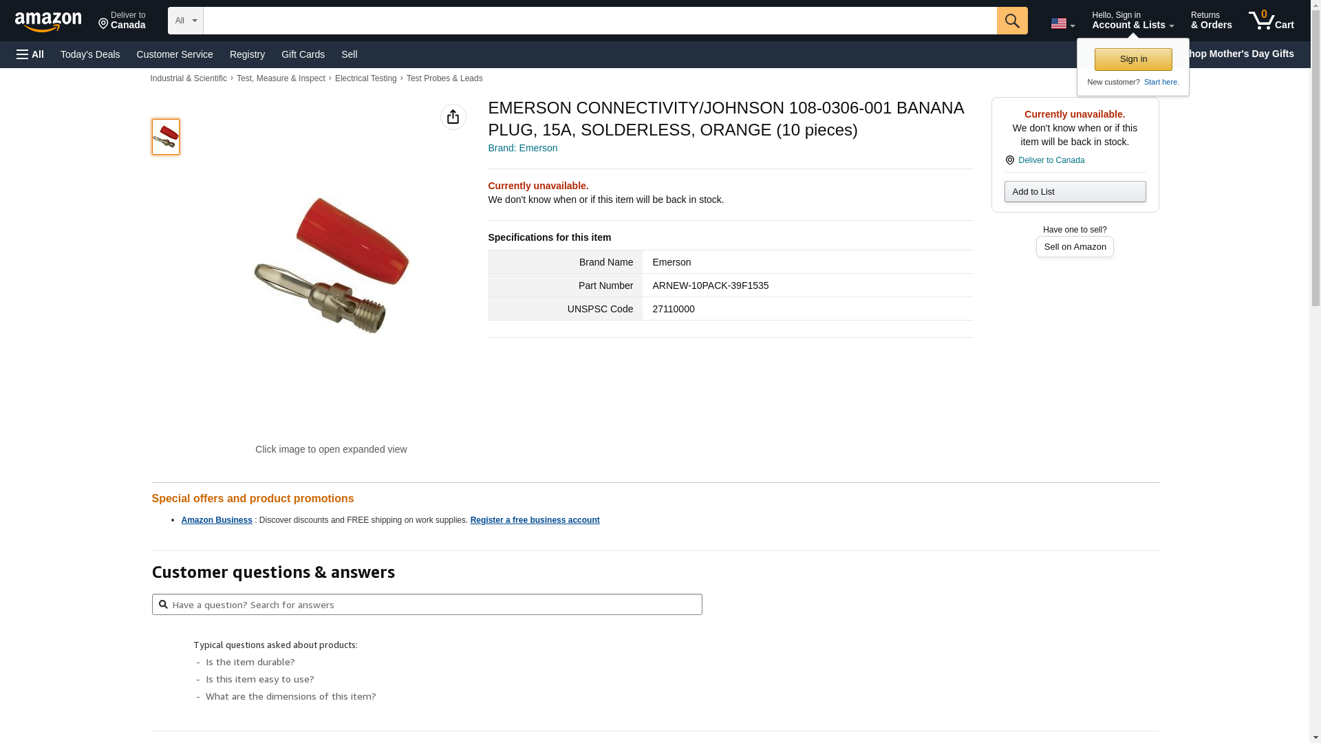 EMERSON CONNECTIVITY / JOHNSON - 108-0306-001 - BANANA PLUG; 15A; SOLDERLESS; ORANGE