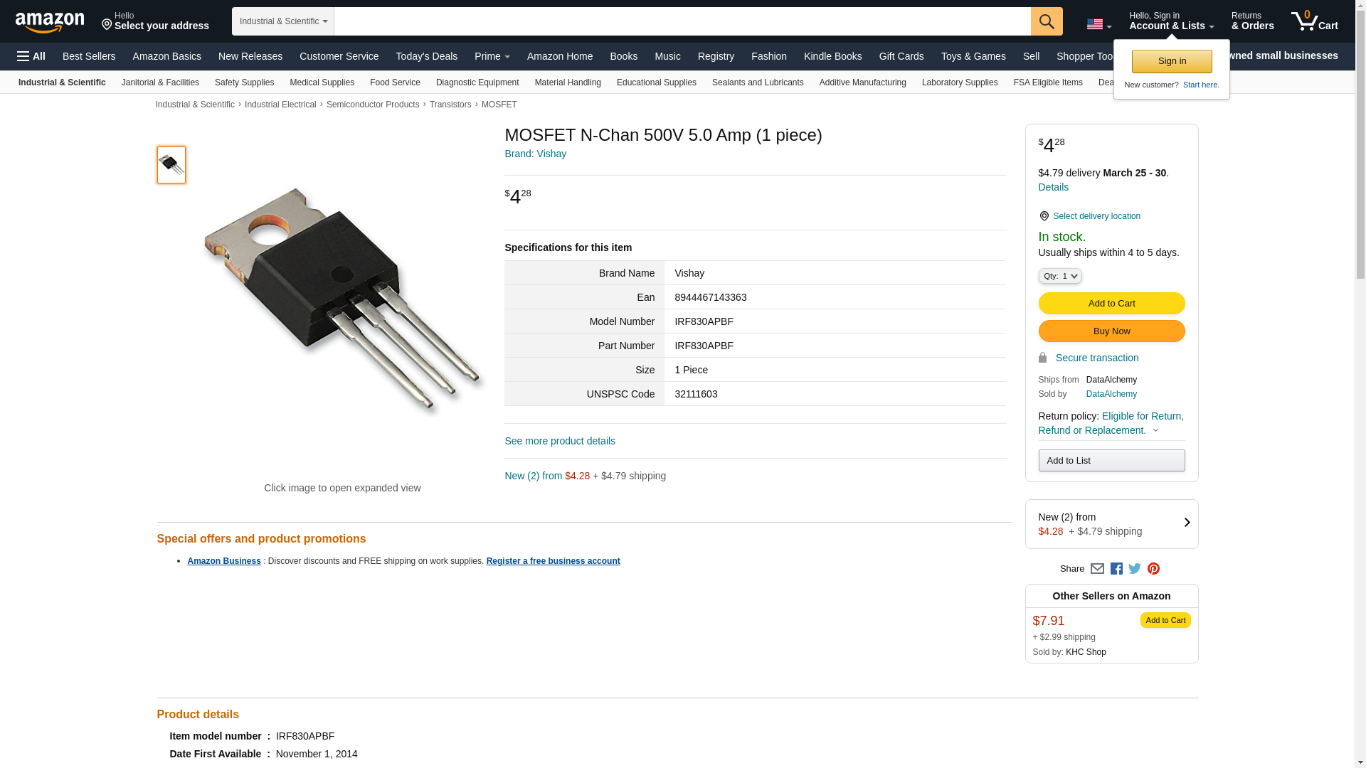 ![]() IBS Electronics | IRF830APBF | 1 | 1 | 1 @ $1.56 | |