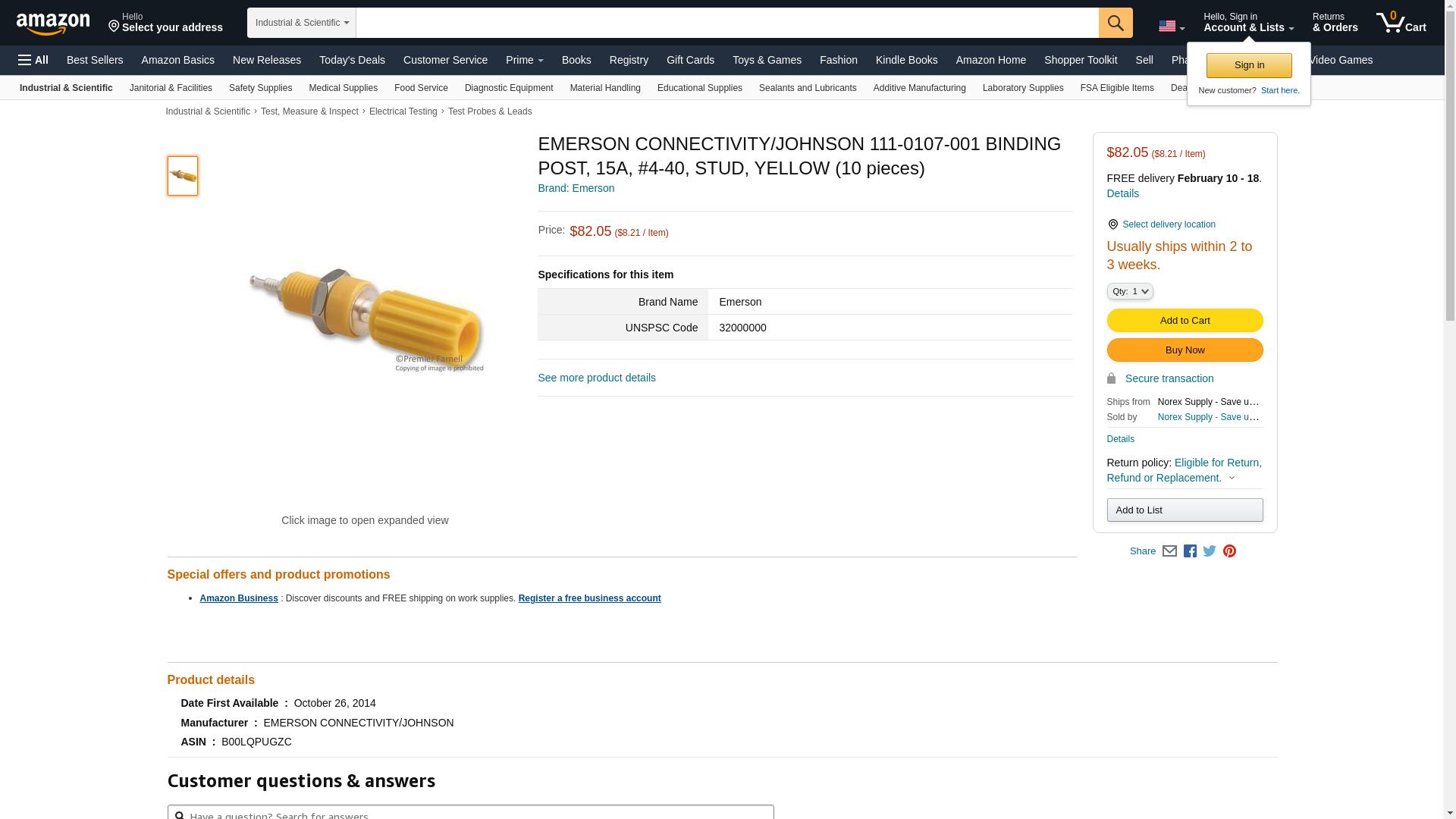 EMERSON CONNECTIVITY/JOHNSON 111-0107-001 Binding Post, 15A, 4-40, Stud, Yellow