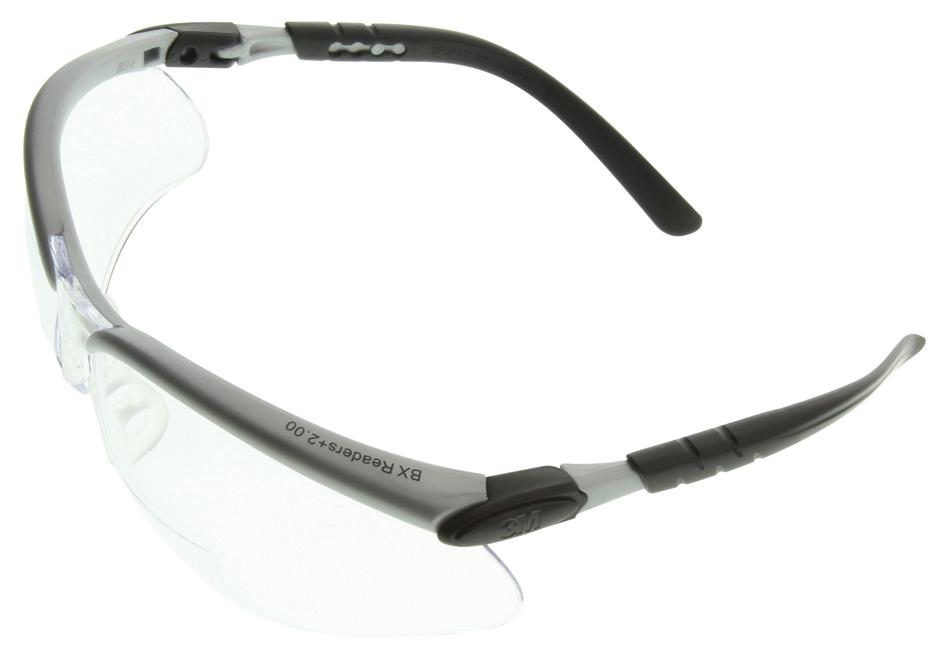 3M Safety Glasses, BX Dual Readers, +2.0, ANSI Z87, Anti-Fog Clear Lens, Silver/Black Frame, Adjustable Length Temples and Lens Angle