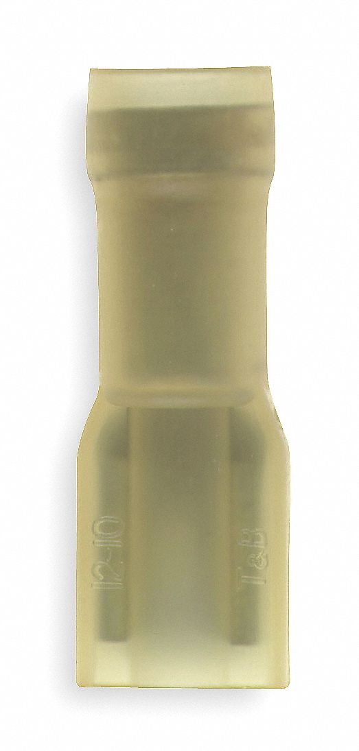 Thomas & Betts, 10RC-2577, Nylon Fully Insulated Female Disconnect, Max Insulation .225, Tab Size .250x.032, Wire Range #12-#10 AWG, Color Yellow, Brass, Tin Plated