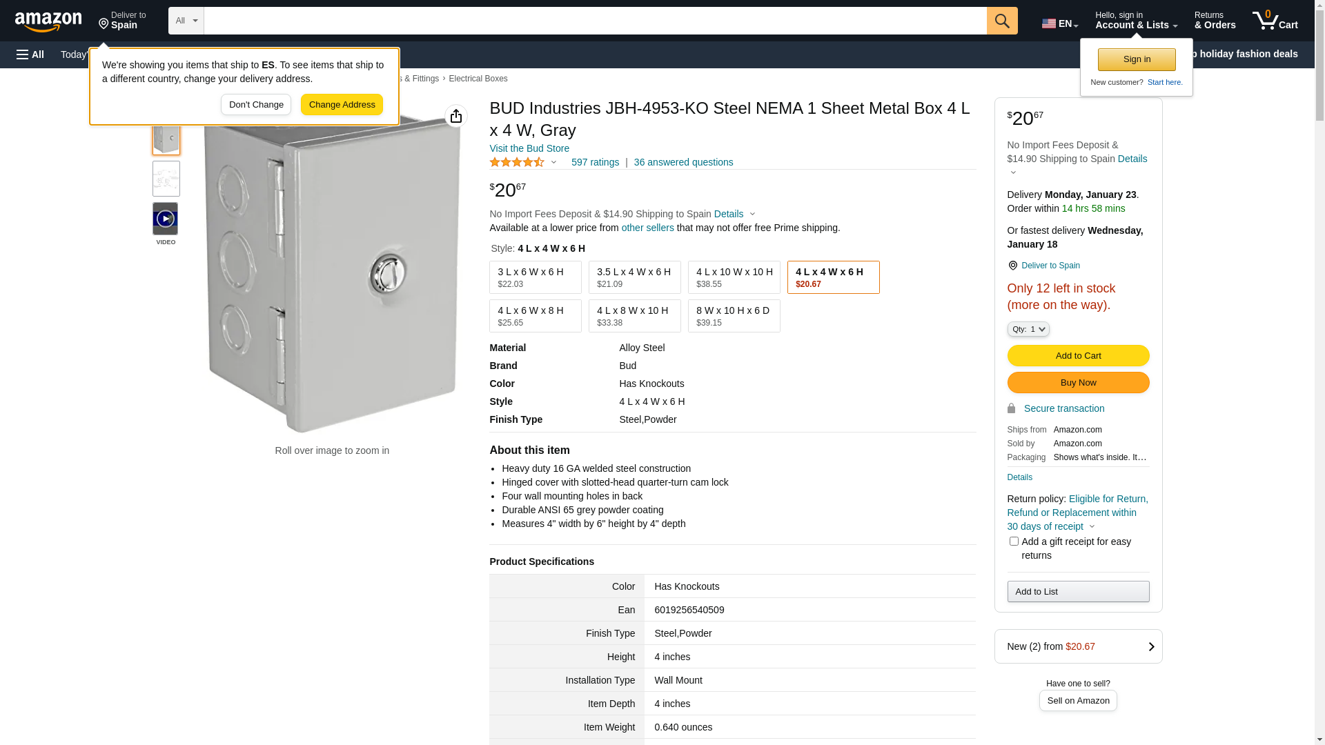 BUD Industries JBH-4953-KO Steel NEMA 1 Sheet Metal Box 4" L x 4" W x 6" H, Gray