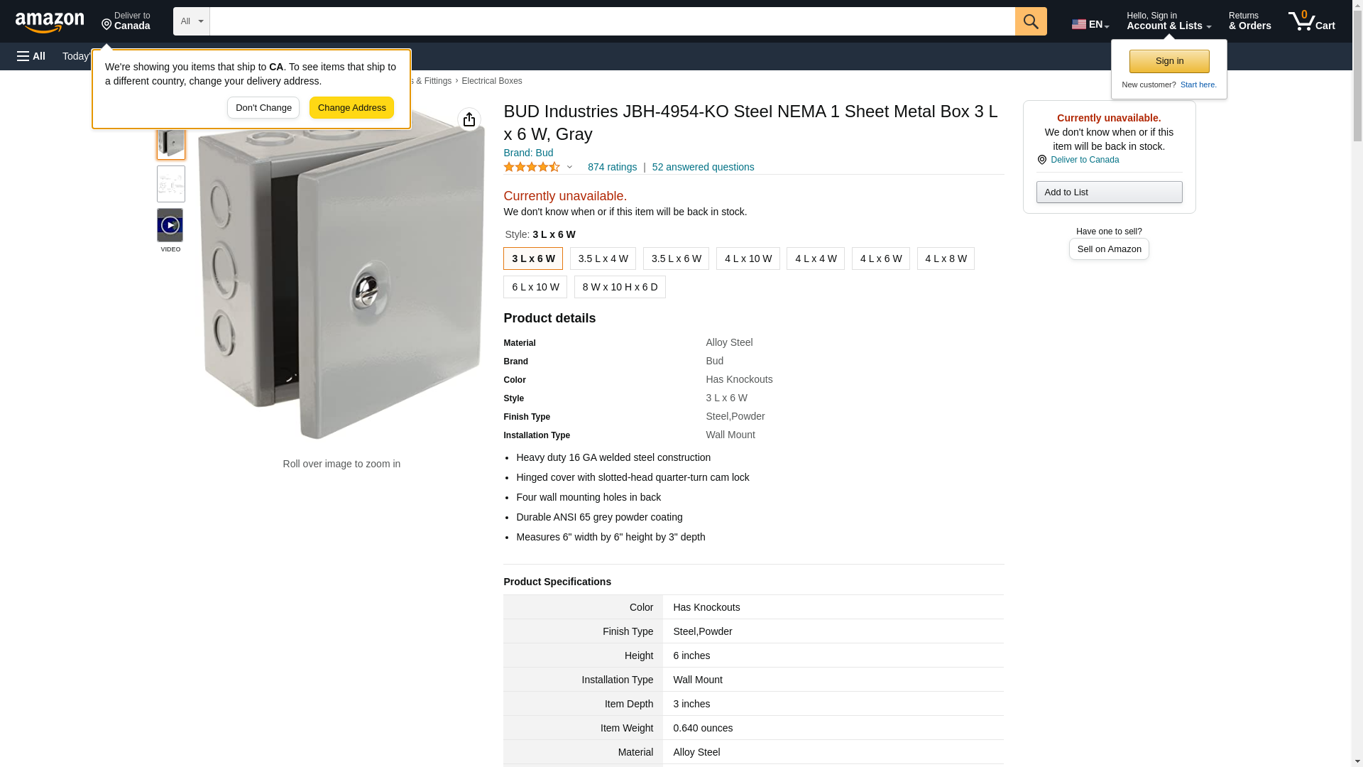 BUD Industries JBH-4954-KO Steel NEMA 1 Sheet Metal Box 3" L x 6" W x 6" H, Gray