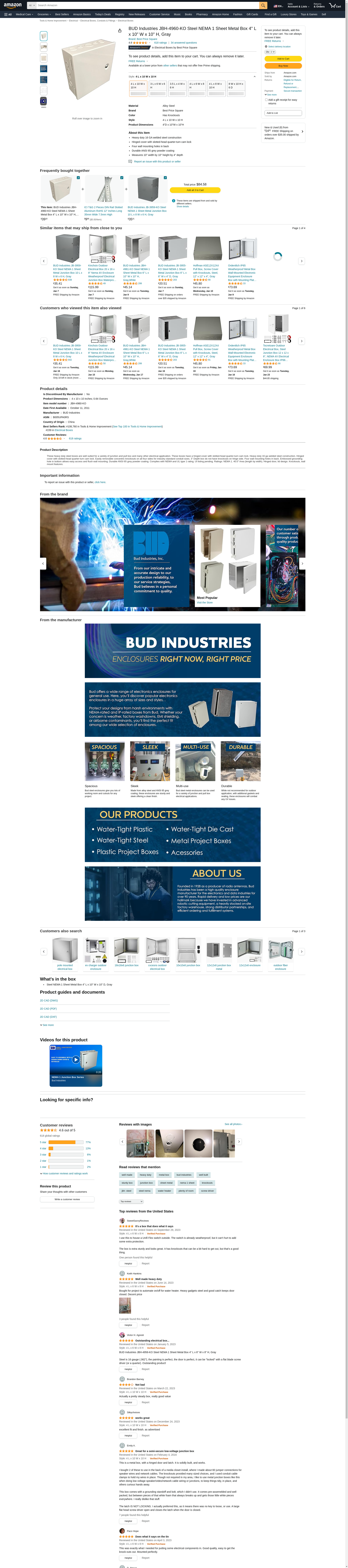 Bud Industries Enclosure, Junction Box, Steel, Gray - JBH-4960-KO