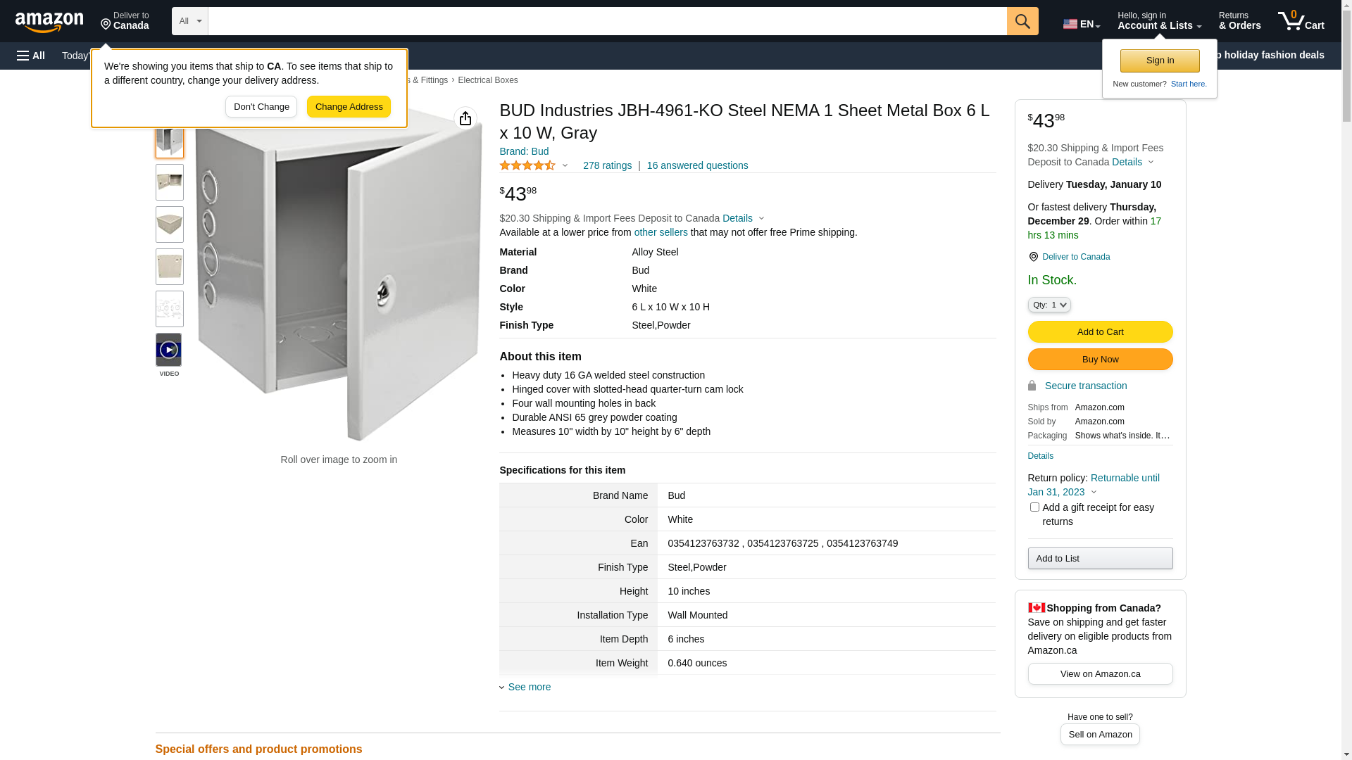 BUD Industries JBH-4961-KO Steel NEMA 1 Sheet Metal Box 6" L x 10" W x 10" H, Gray,White