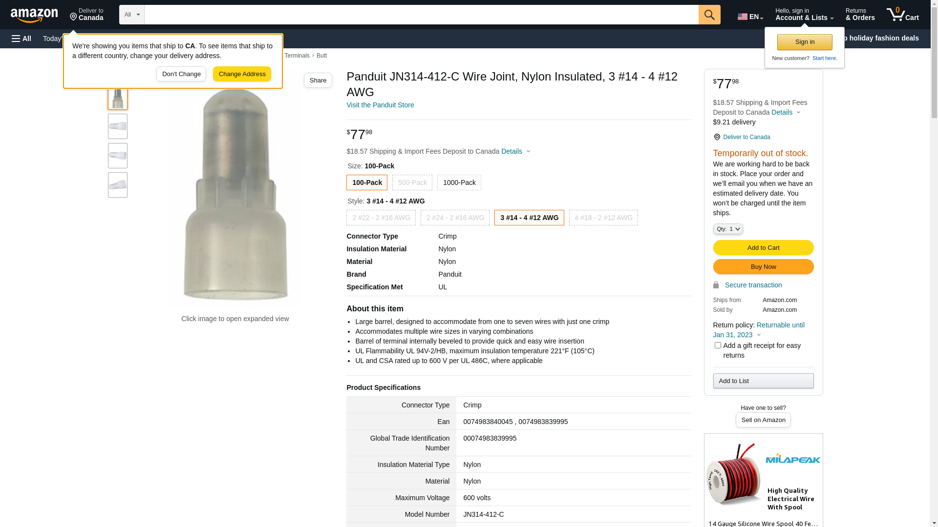 | Feature | Price For: Each Standards: UL 486C, CSA22.2 No. 65, American Bureau of Shipping (ABS) Max. Temp.: 221 Degrees F Min. Wire Combination: (2) 12 AWG Max. Voltage: 600V Item: Closed-End Crimp Connector Insulation Type: Nylon Max. Wire Combination: (4) 18 AWG Country of Origin (subject to change): Mexico |