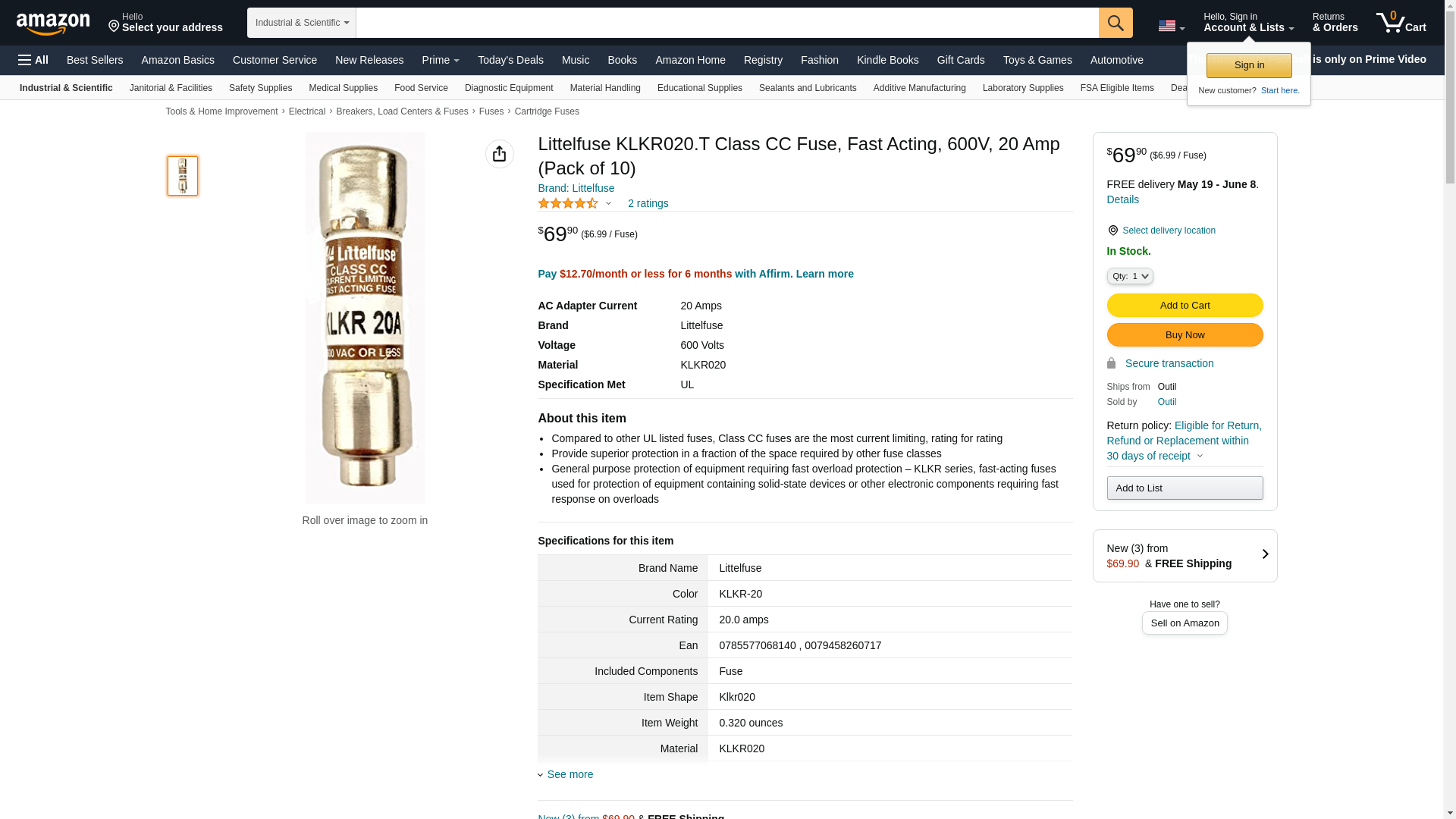 Littelfuse KLKR020.T Class CC Fuse, Fast Acting, 600V, 20 Amp (Pack of 10)