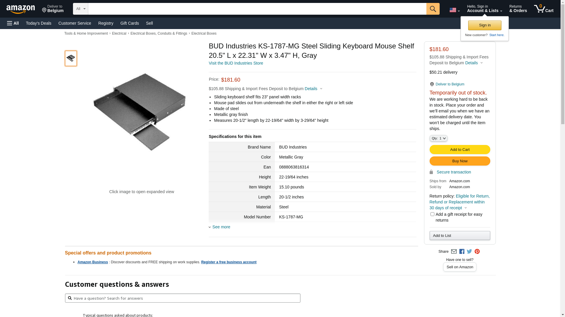 BUD Industries KS-1787-MG Steel Sliding Keyboard Mouse Shelf 20.5" L x 22.31" W x 3.47" H, Gray