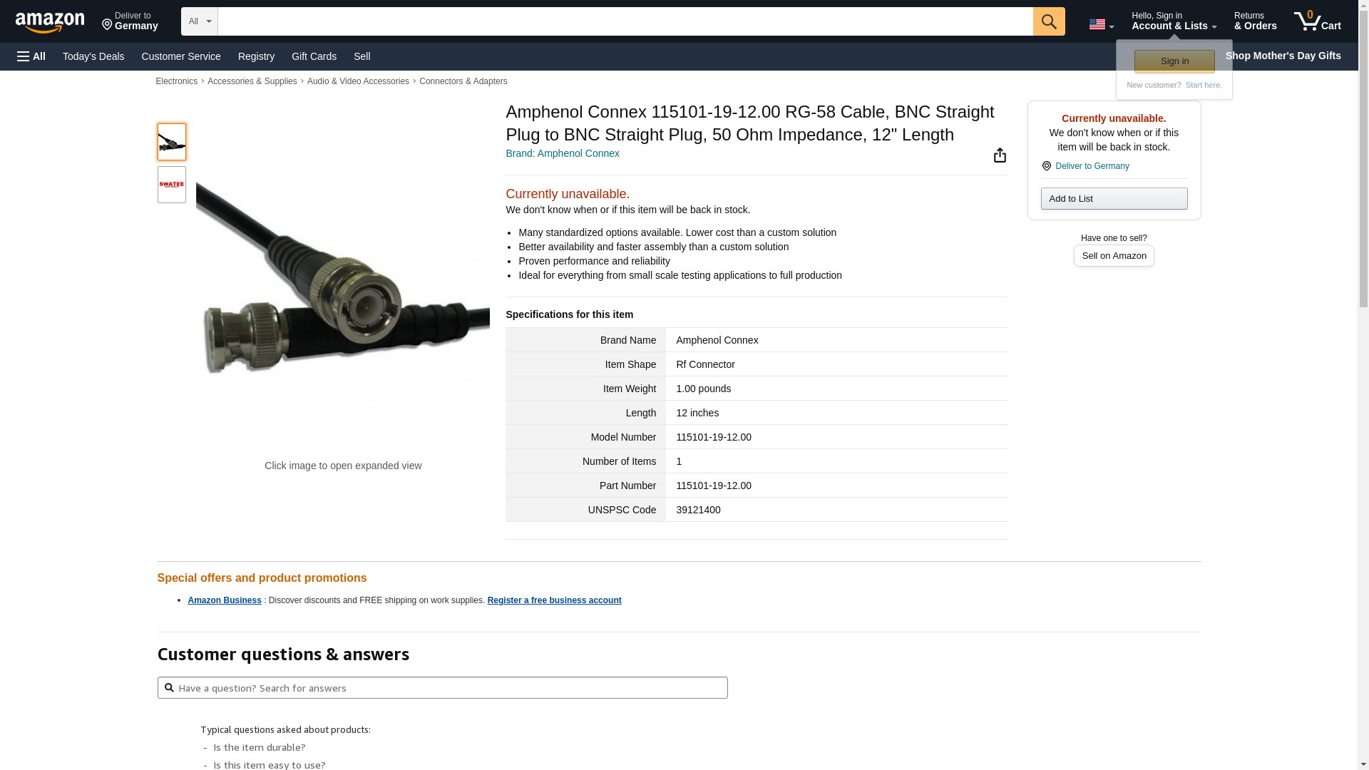 Amphenol Connex 115101-19-12.00 COAXIAL Cable Assy, BNC Male-Male, RG58, 12IN, Black