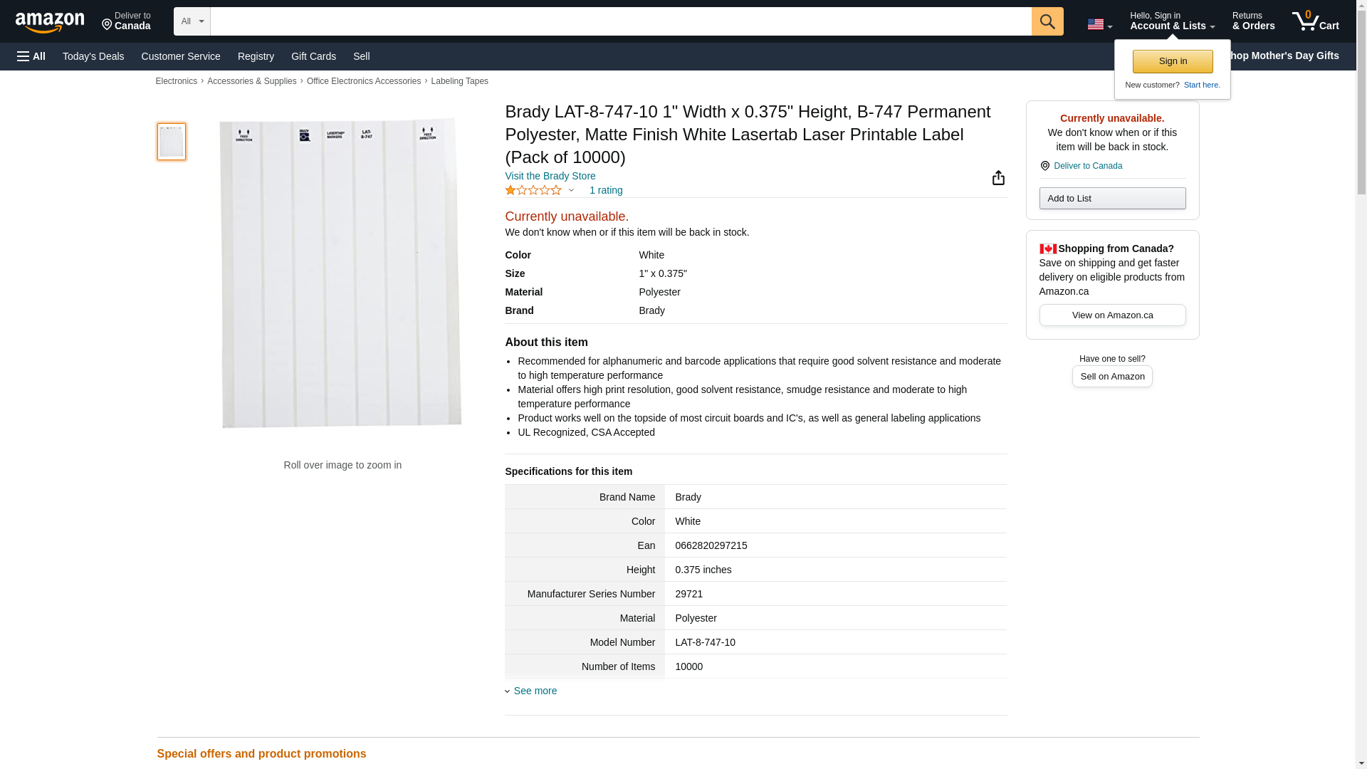 Brady LAT-8-747-10 1" Width x 0.375" Height, B-747 Permanent Polyester, Matte Finish White Lasertab Laser Printable Label (Pack of 10000)