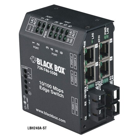 Heavy-Duty Edge Switch, Standard, (4) Copper + (2) Fiber, Single-Mode, 115-VAC, Multimode, ST Feature two fiber and four copper ports to expand your network. For office environments. Tough steel case. RJ-45 ports support autonegotiation, so you can easily attach any 10- or 100-Mbps device. Support both half- and full-duplex operation. Two sets of LEDs enable you to see status information from the front, top, or side Support VLAN tagging and spanning tree passthrough. Include Link-Loss-Learn (LLL) feature for fast network recovery