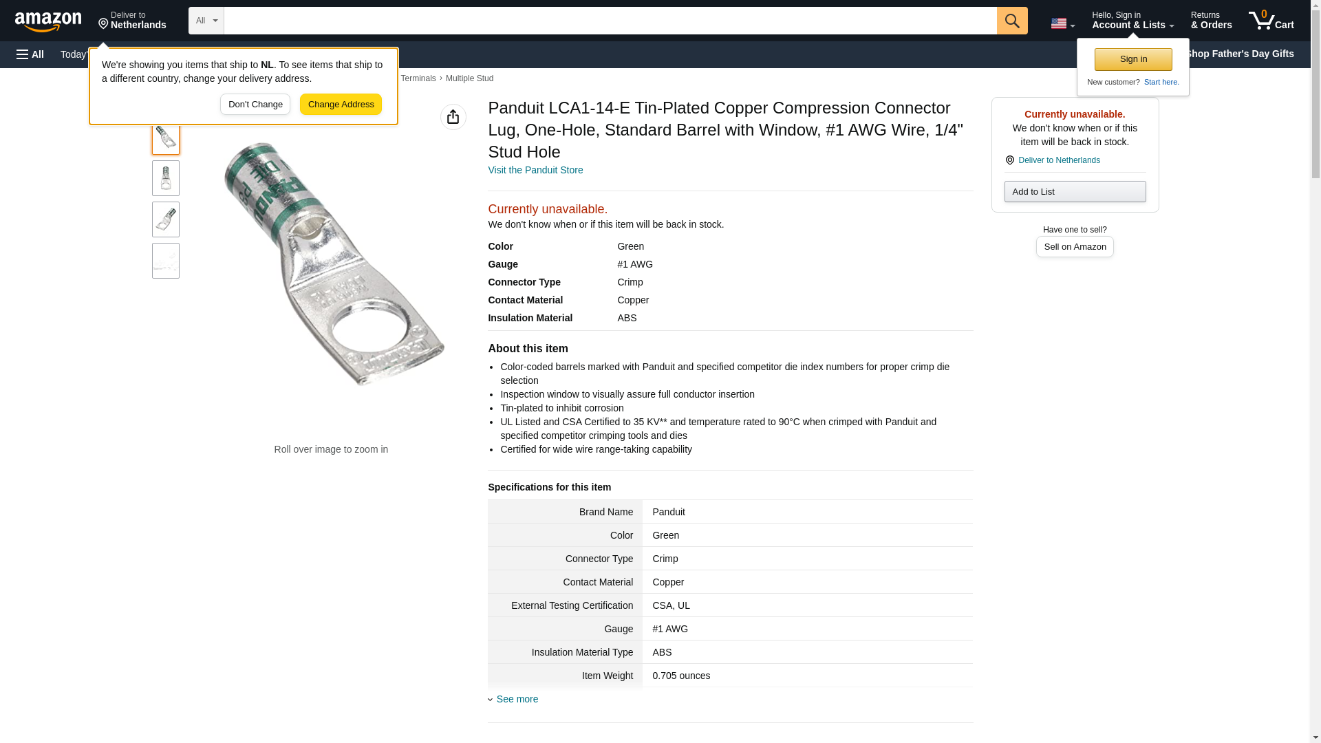 Panduit LCA1-14-E; Copper Compression Lug # 1AWG; 1/4" Bolt