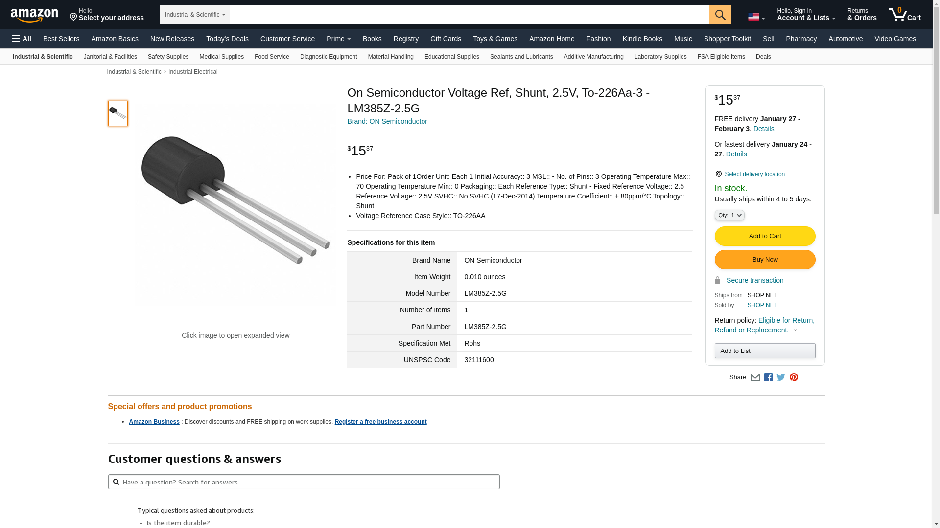 On Semiconductor Voltage Ref, Shunt, 2.5V, To-226Aa-3 - LM385Z-2.5G