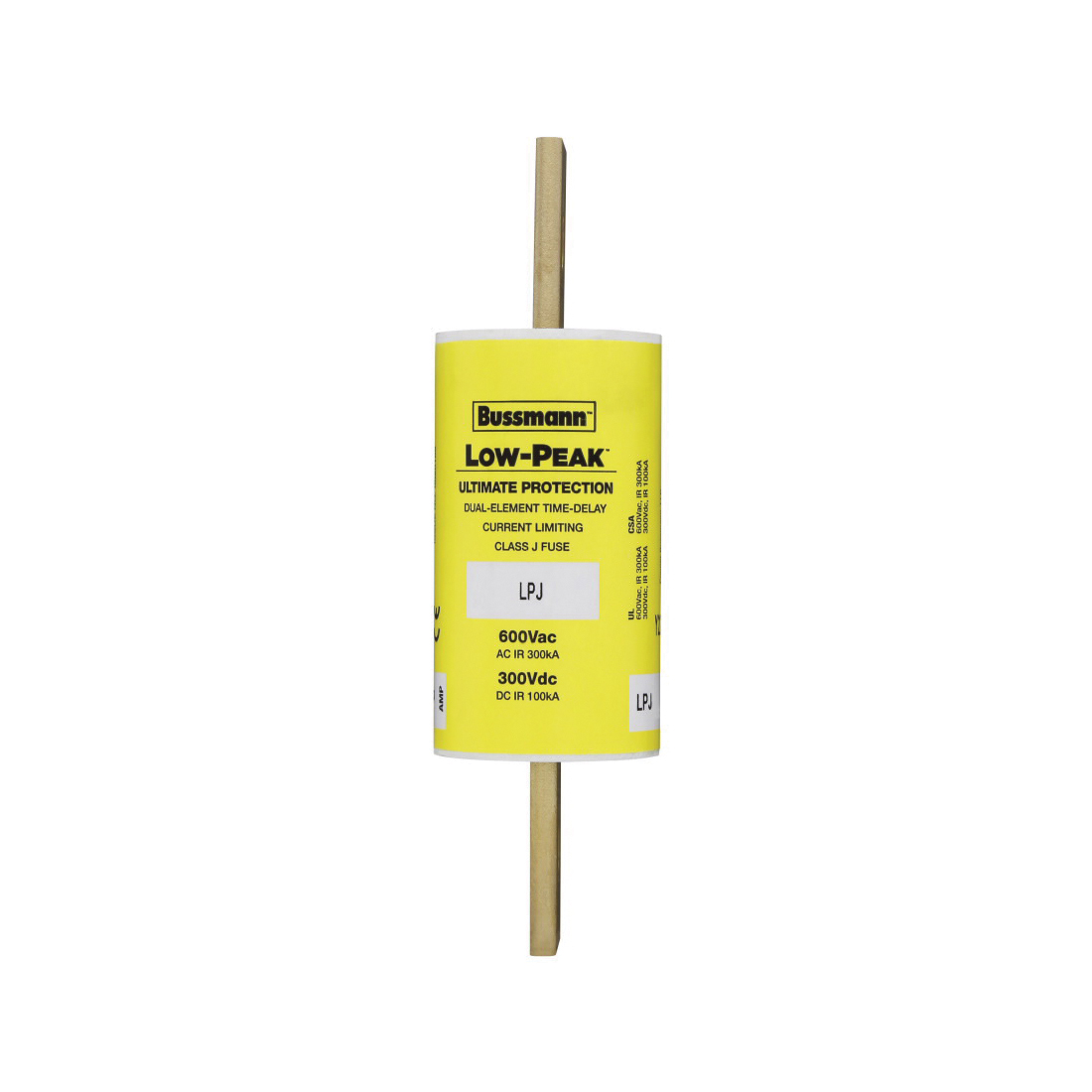 'Fuse, 110A Fuse Amps, Nonindicating, LPJ Series, 600VAC/300VDC Fuse Voltage Rating, Time Delay, Dual Element, J Class, Body Material Melamine, Nonrejection, Body Style Blade, Fuse Interrupt Rating 300kA at 600VAC, 100kA at 300VDC, Length 5-3/4 In., Width Not Applicable, Fuse Holder Code AC, Depth Not Applicable, Diameter 1-5/8 In., Functionally Equal To Littelfuse JTD, Standards CE/UL-Special Purpose Guide JFHR/CSA Class 1422-02'
