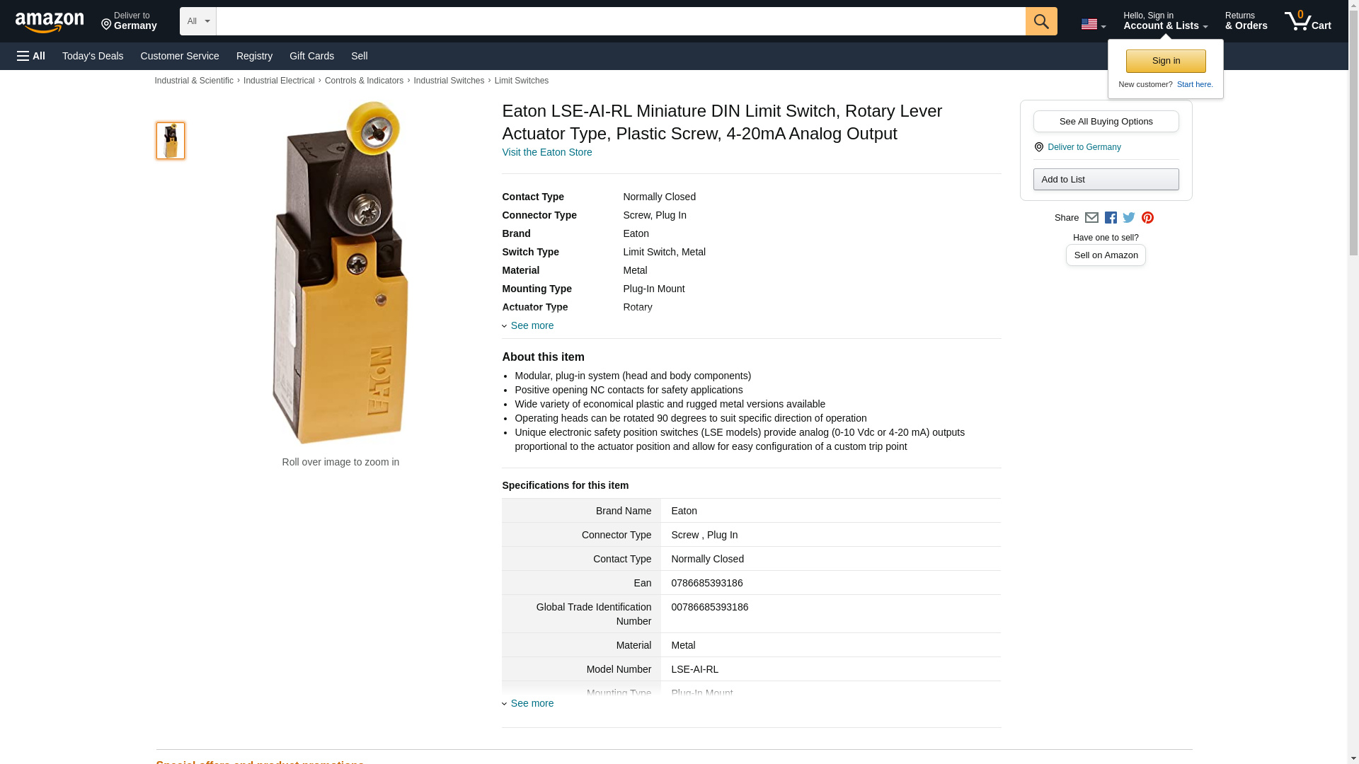 Eaton LSE-AI-RL Miniature DIN Limit Switch, Rotary Lever Actuator Type, Plastic Screw, 4-20mA Analog Output