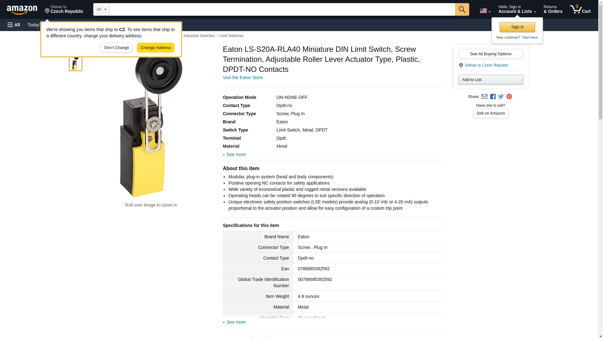 Eaton LS-S20A-RLA40 Miniature DIN Limit Switch, Screw Termination, Adjustable Roller Lever Actuator Type, Plastic, DPDT-NO Contacts