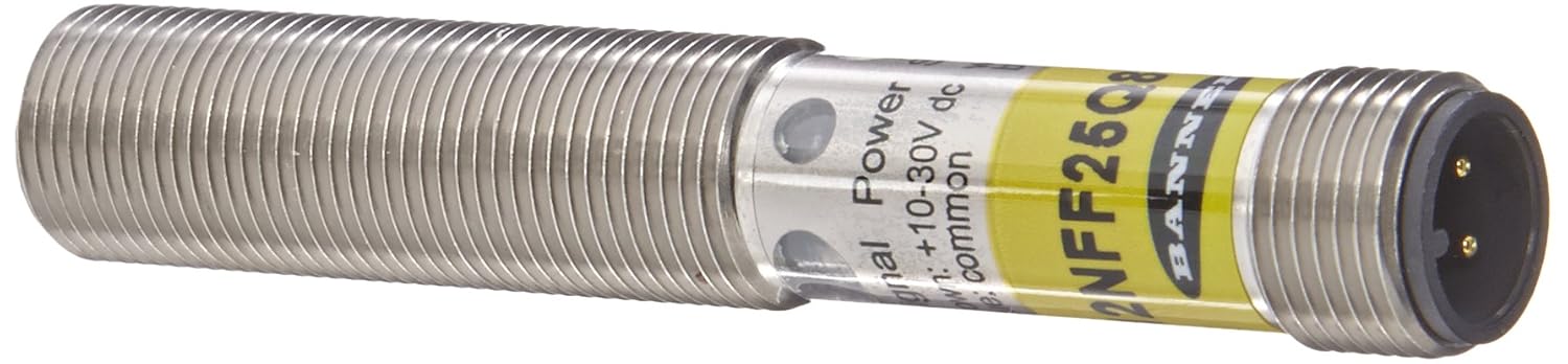 Banner M12NFF25Q8 Barrel-Style Sensor, Fixed-Field Sensing Mode, 4-Pin Integral Euro-Style Connector, M12 Threaded Mount, 660 nm Wavelength Visible Red LED, NPN Output, 25 mm Sensing Range Cutoff