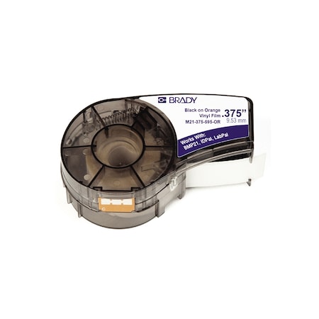<p><strong> Brady, M21-375-595-OR, 142809 0.375"x21' Orange BMP21 Series Indoor/Outdoor Vinyl Label</strong></p><p>This durable, low-shrink vinyl with ultra-aggressive adhesive is ideal for labeling pipes, equipment, shelves and nearly any other industrial surface.</p><ul><li>Highly pliable material with high-tack permanent adhesive for rough, highly textured, dirty and harsh environment surfaces--including outdoors</li><li>Conforms and adheres to "difficult" surfaces like painted cinder blocks, painted wood, textured plastic, paper-jacketed pipes and blow-molded cases</li><li>Resistant to exposure to chemicals, greases and oils, salt spray, cleaners and detergents and general industrial grime</li><li>All-in-one cartridge includes ribbon and label supply</li></ul>