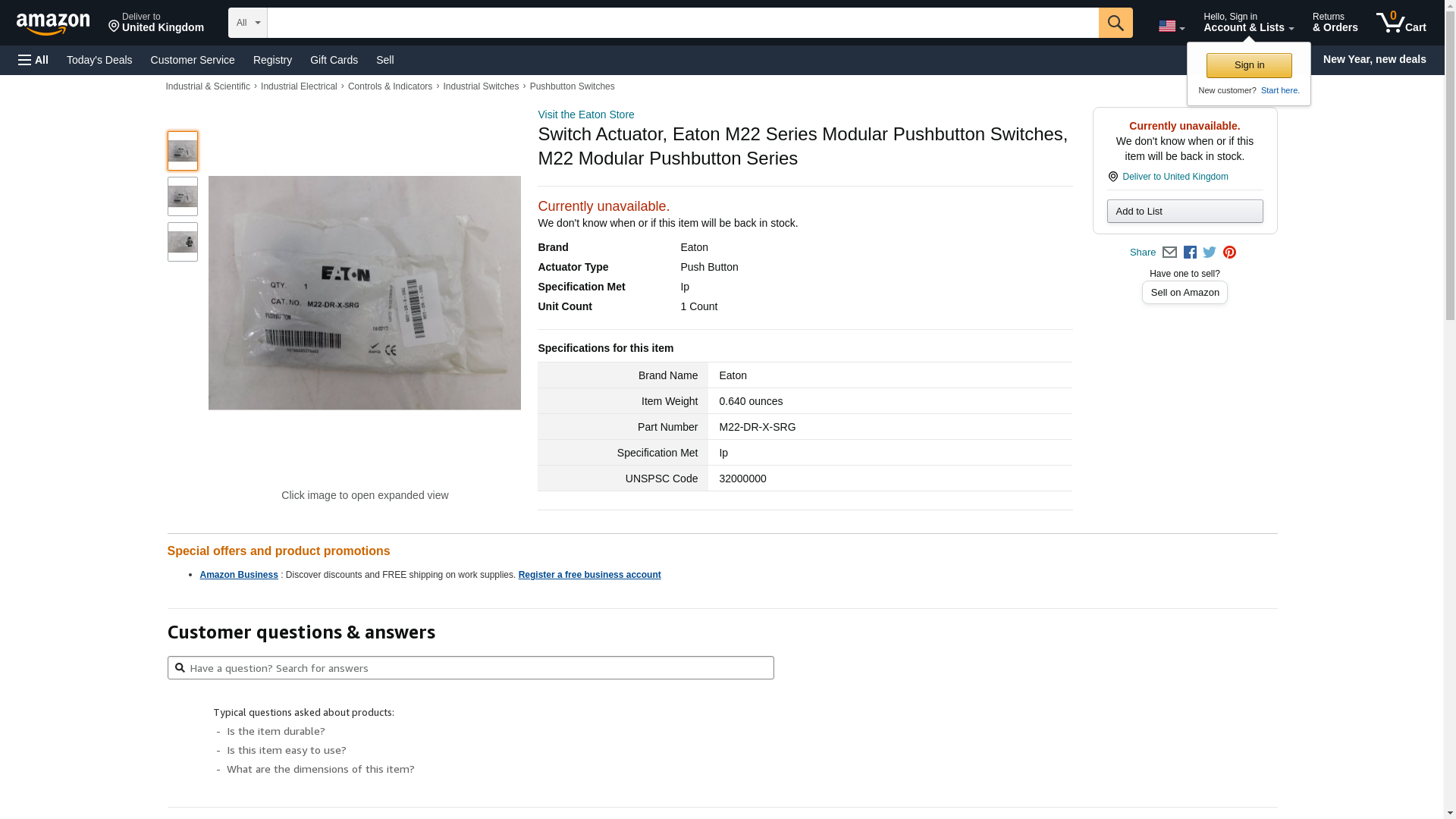 | Feature | <b>Price For:</b> Each <b>For Use With</b>: Eaton M22 Series Modular Pushbutton Switches <b>IP / NEMA Rating</b>: - <b>Product Range</b>: M22 Modular Pushbutton Series |