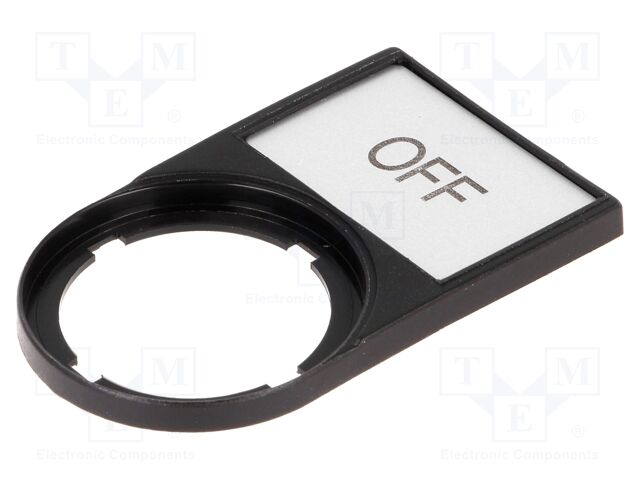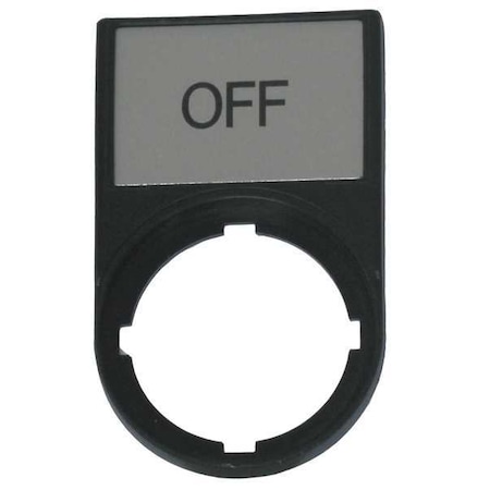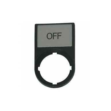 The EATON legend plate is a rectangular plate for EATON C22 and M22 push buttons.<br /><br /> Item: Legend Plate<br /> Shape: Rectangular<br /> Legend: Off<br /> For Use With: Eaton C22 and M22 Pushbuttons<br /> Legend/Background Color: Black<br /> Material: Polyester<br /> Height: 1.97"<br /> Width: 1.30"<br /> Diameter: 22mm<br />