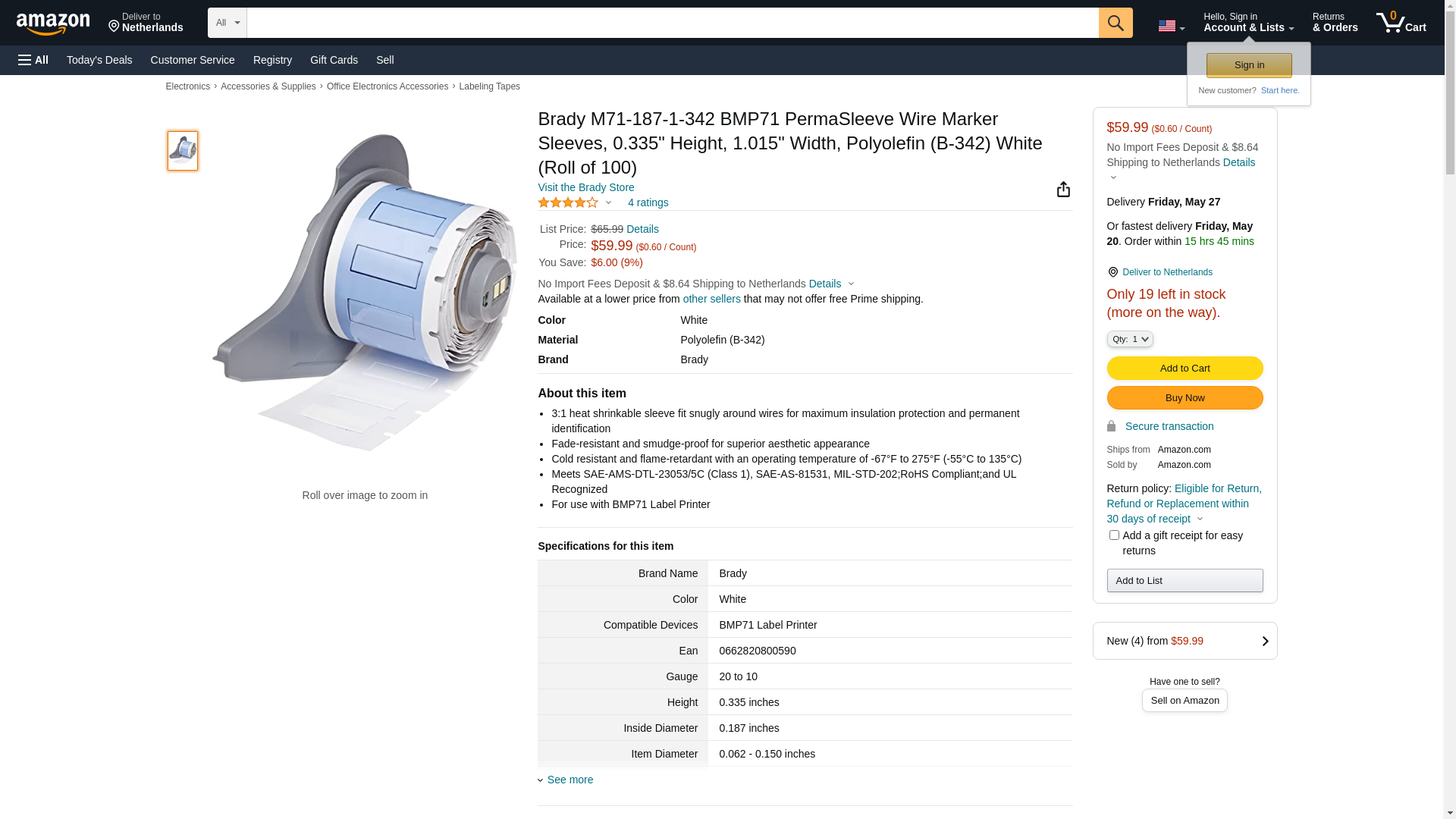 Brady M71-187-1-342, 115087 0.187" Dia.x1 White BMP71 Polyolefin Wire Marking Sleeve, 4 Rolls of 100 pcs