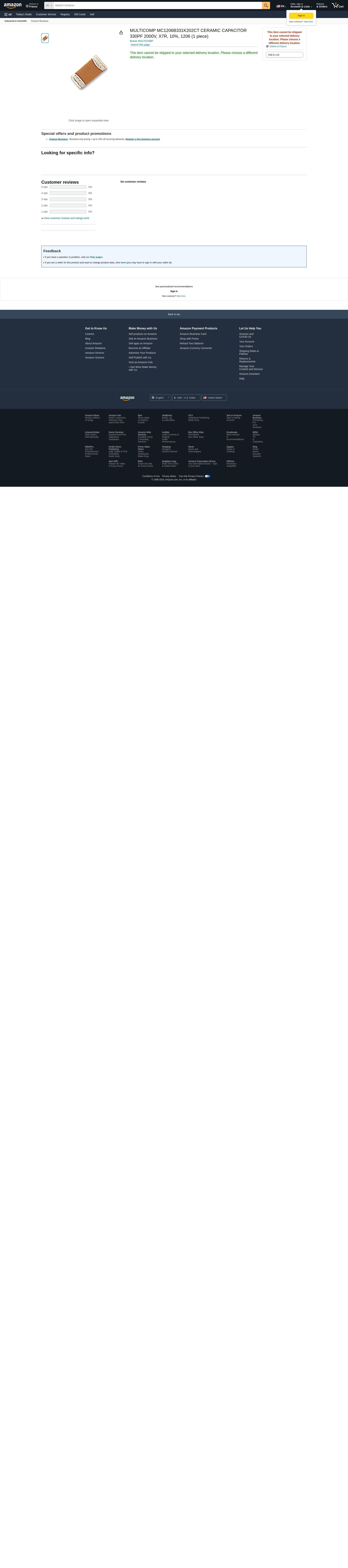 | Feature | <b>Price For:</b> Pack of 1<b>Order Unit:</b> Tape & Reel Cut\xa01 <b>Capacitance:</b>: 330 <b>Capacitance Tolerance:</b>: \xb1 10% <b>Capacitor Case Style:</b>: 1206 [3216 Metric] <b>Capacitor Terminals:</b>: SMD <b>Ceramic Capacitor Case:</b>: 1206 [3216 Metric] <b>Dielectric Characteristic:</b>: X7R <b>MSL:</b>: - <b>Operating Temperature Max:</b>: 125 <b>Operating Temperature Min:</b>: -55 <b>Packaging:</b>: Cut Tape <b>Product Range:</b>: MC Series |