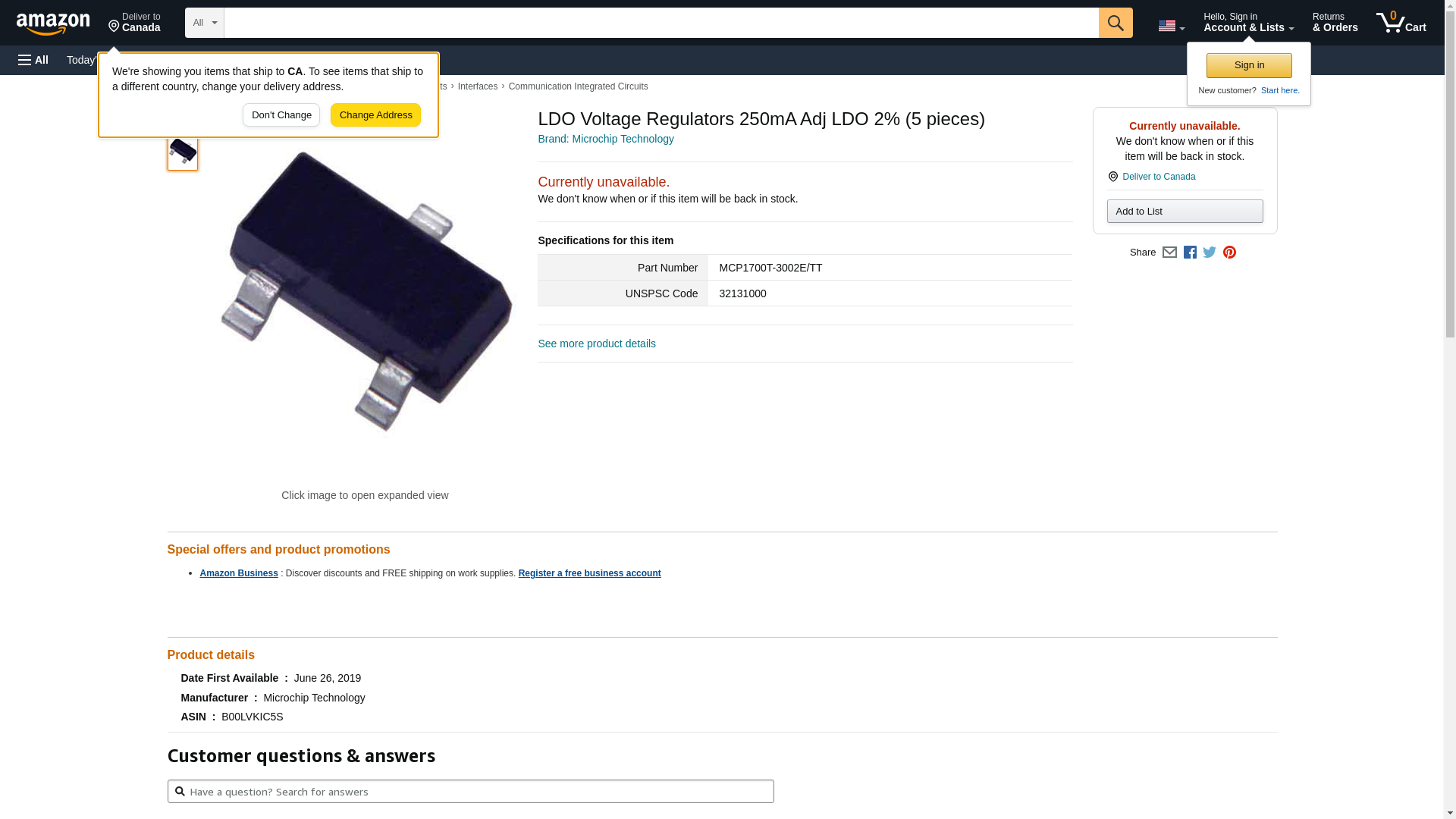 | Onlinecomponents.com | MCP1700T-3002E/TT | 1 | 6000 | 1 | 1 @ $0.44, 1000 @ $0.40, 1500 @ $0.36, 3000 @ $0.27, 6000 @ $0.26 |