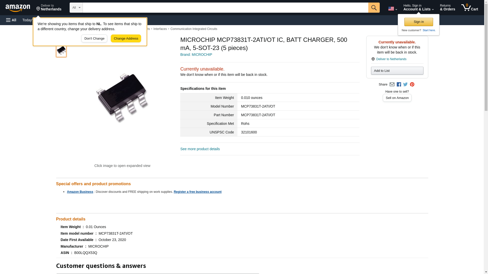 | Onlinecomponents.com | MCP73831T-2ATI/OT | 1 | 3000 | 1 | 1 @ $0.69, 1000 @ $0.62, 1500 @ $0.57, 3000 @ $0.42, 6000 @ $0.40 |