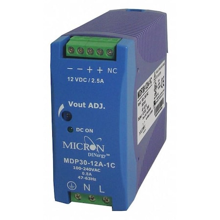 Power Supply, Din Rail Mount, Plastic Case, Output 30W x 12VDC, Input 85-264VAC, 1-Phase, 40.5MM Width, UL 508/60950, cUL, CE EN61000, UL 1604/ISA 12.12.01 Class 1&2 DIV 2, UL 1310 Class 2